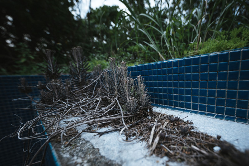 廃墟に生える雑草の写真素材です。朽ちた建物の基礎部分に残る青いタイルの周囲に、緑の雑草が繁茂し、建物全体が風化して劣化している不気味な様子が写っています。ホラーサイトやミステリー小説の表紙、廃墟をテーマにしたデザイン制作などにおすすめです。