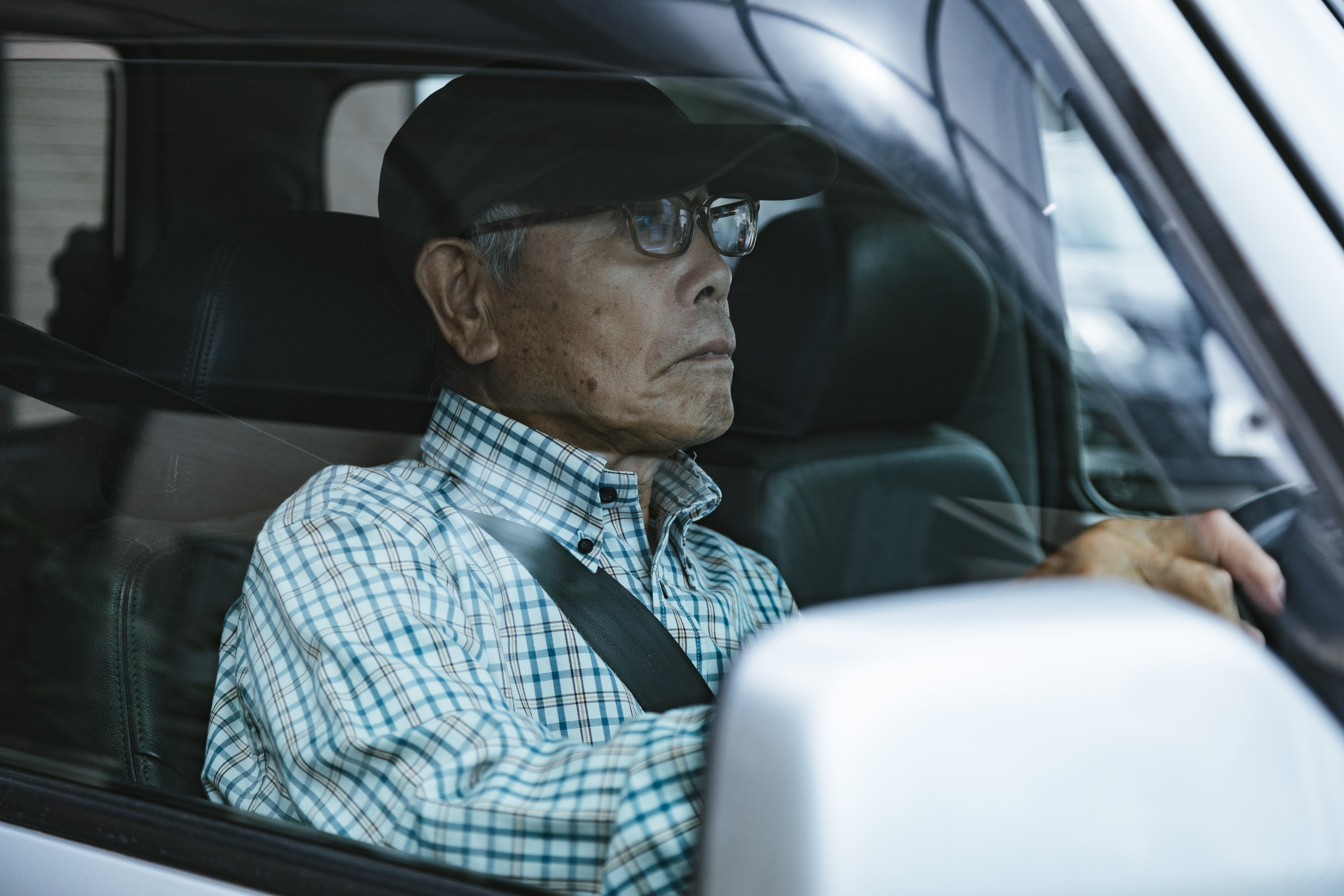 車を運転する高齢者男性の写真素材です。チェック柄のシャツを着た男性が運転席に座り、両手でハンドルを握って前方を見つめている様子を撮影しました。老人ドライバーの日常や交通安全啓発、運転に関する記事やWebサイト制作などにおすすめです。