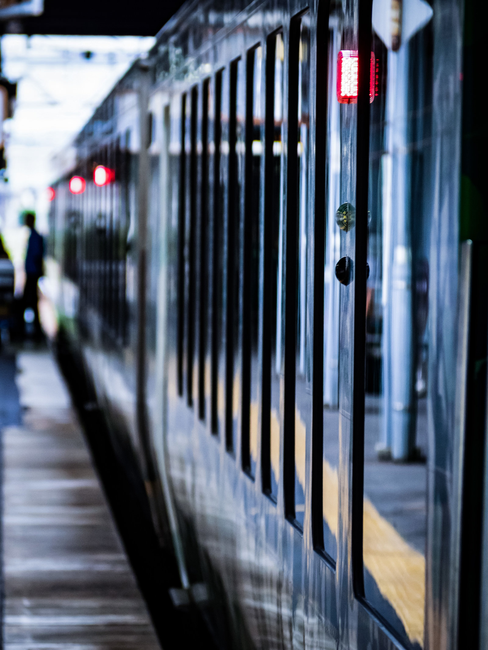 駅ホームで停車中のリゾートしらかみ(ブナ編成)の写真素材です。ホームから見た車両側面にはブルーと白のツートンカラーが映り、窓には周囲の景色が映り込んでいます。鉄道写真や交通関連の記事、列車旅行の情報発信などにおすすめです。