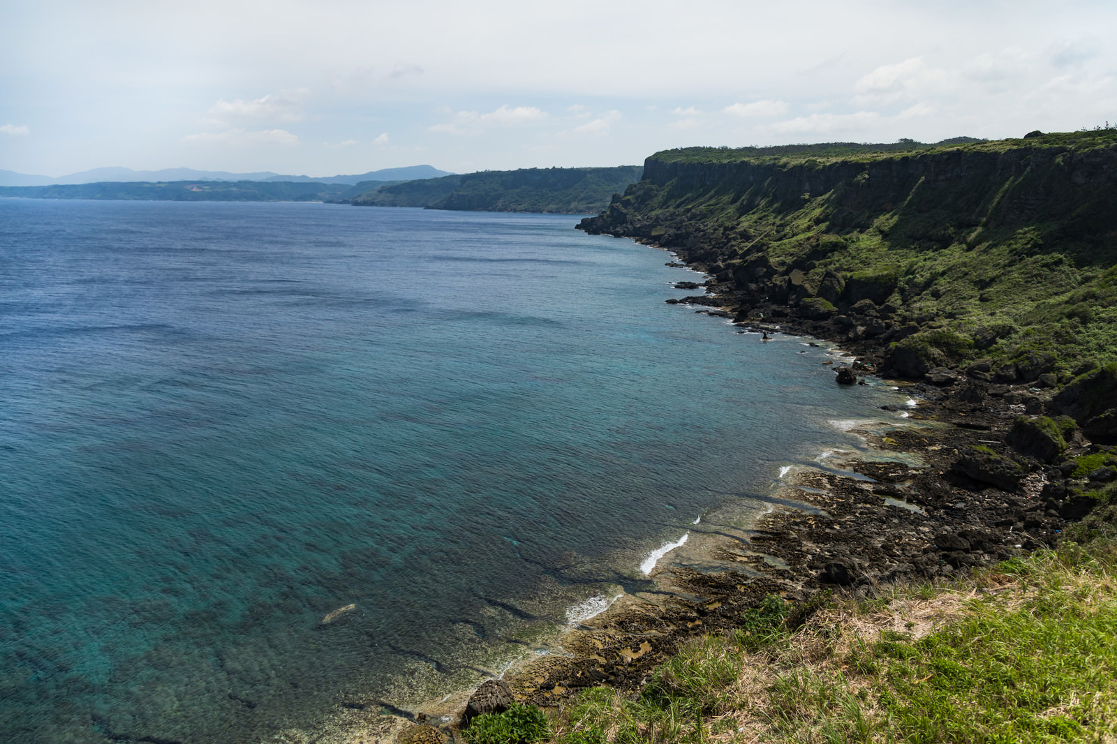 犬田布岬から望む隆起サンゴ礁の海岸線の写真素材です。徳之島を代表する雄大な自然景観で、エメラルドグリーンの海と緑に覆われた崖が特徴的な海岸線が広がっています。観光パンフレットや自然関連のWebサイト、徳之島の情報発信などにおすすめです。