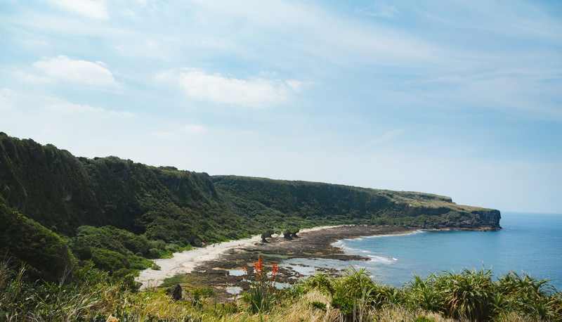 徳之島の犬の門蓋から一望する海岸線の写真素材です。高い断崖の上から見下ろす紺色の海と白い雲が浮かぶ青空、緑豊かな海岸線が広がり、迫力ある自然景観を撮影しています。観光サイトやブログ、自然風景をテーマにしたデザイン素材などに最適です。