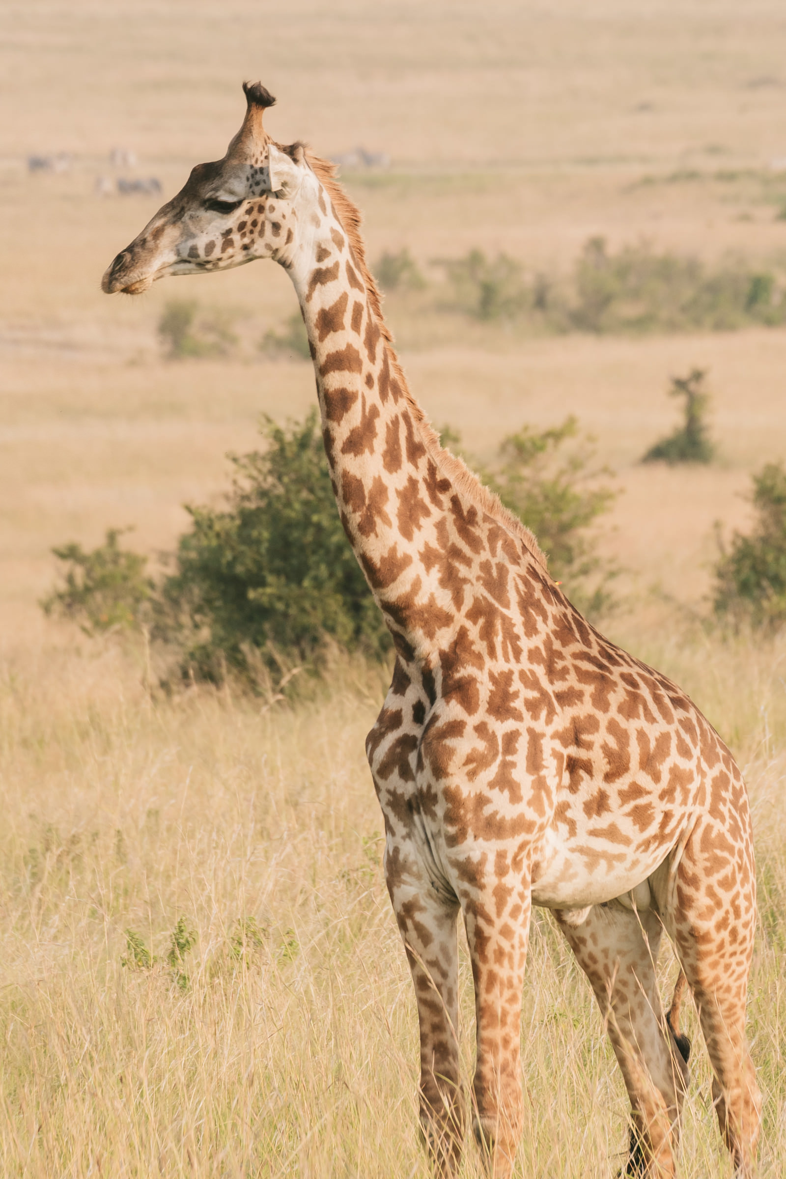 サファリの草原を歩くキリンの写真素材です。茶色の斑点模様を持つキリンが乾燥した広大な草原地帯をゆったりと歩んでおり、アフリカの野生動物の生態が伝わる一枚。野生動物の資料やアフリカの自然を紹介する記事、自然番組の素材などにおすすめです。