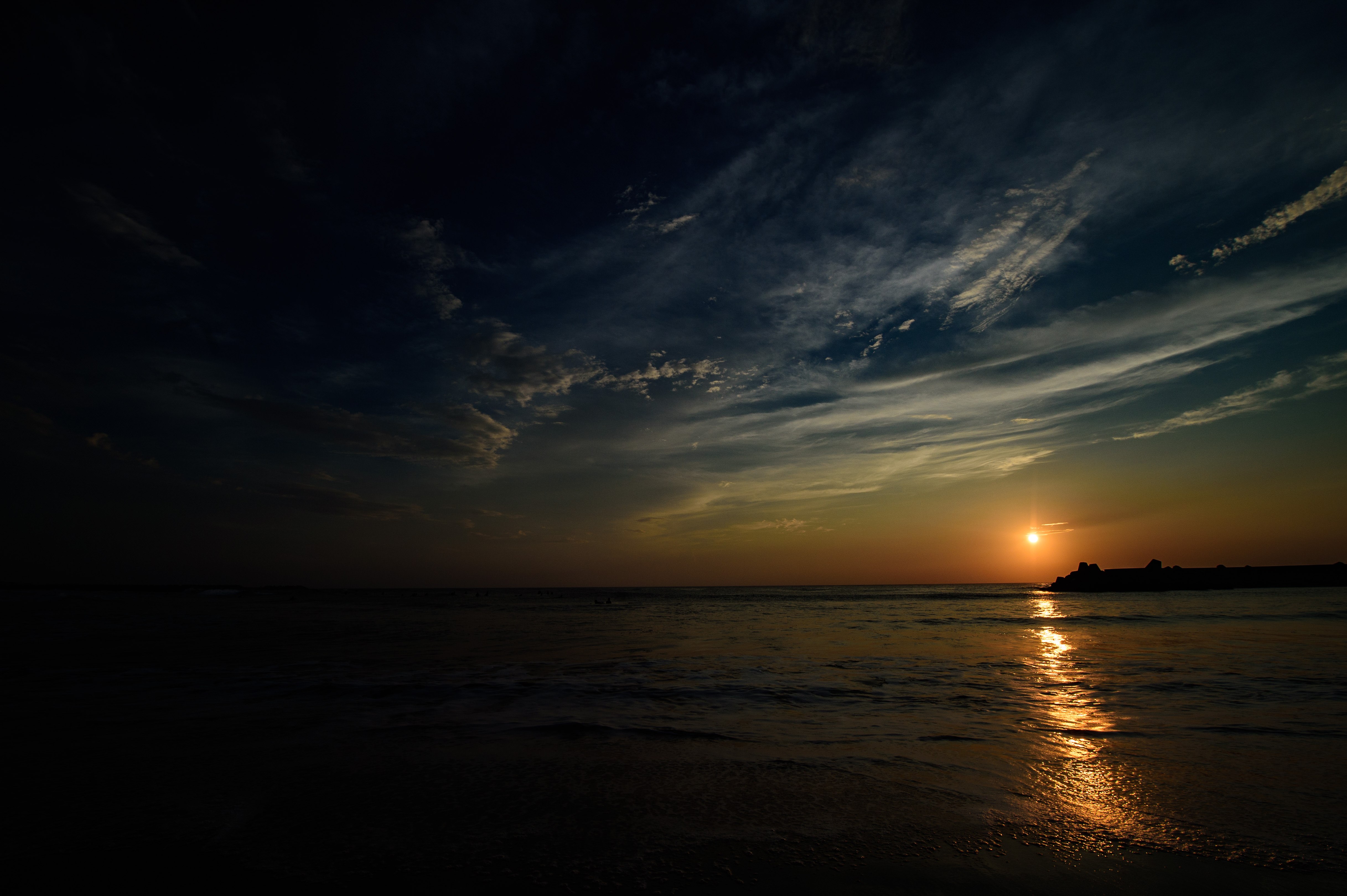 千葉県一宮町の一宮海岸に浮かぶレイラインの写真素材です。夜明けの薄明の中、水平線から昇る朝日が海面を照らし、細長い光の道を描く風景で、手前ではサーファーのシルエットが波を待つ様子が見えます。朝焼けや日の出の時間帯の風景素材として、雑誌や旅行ガイド、プロモーション映像などに活用できます。
