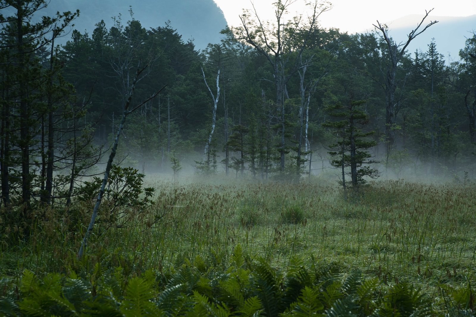 夜明けの朝霧に包まれる岳沢湿原の写真素材です。湿原の向こうに見える山々と手前の緑豊かな植生が朝の静寂な空間を作り出しています。薄く立ち込める霧が湿原全体を優しく覆い、自然風景やエコツーリズム、季節の変化を表現するコンテンツ制作などにおすすめです。