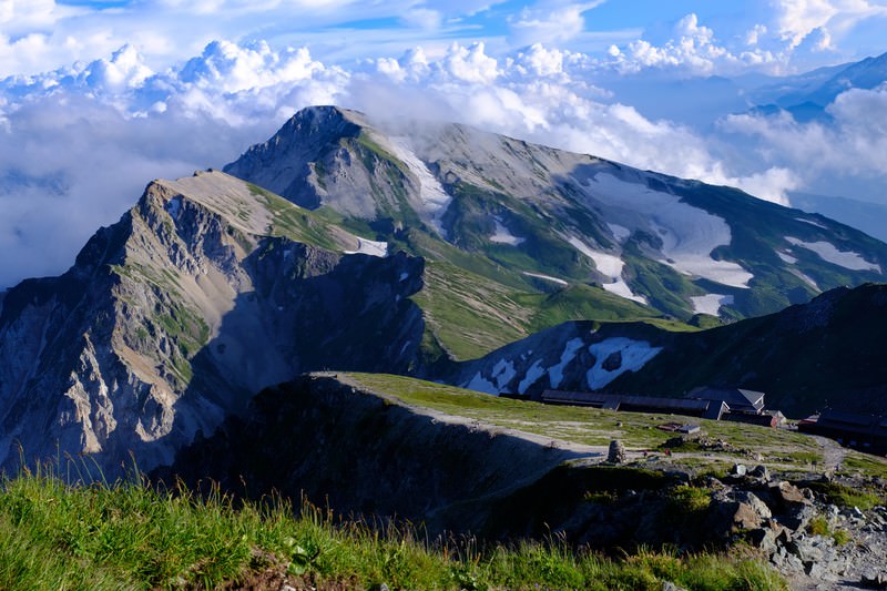 白馬岳の山頂付近から稜線を見下ろした写真素材です。山腹に雲が広がり、山小屋が1棟建っています。登山・トレッキング関連の記事や山岳風景を使ったコンテンツにどうぞ。