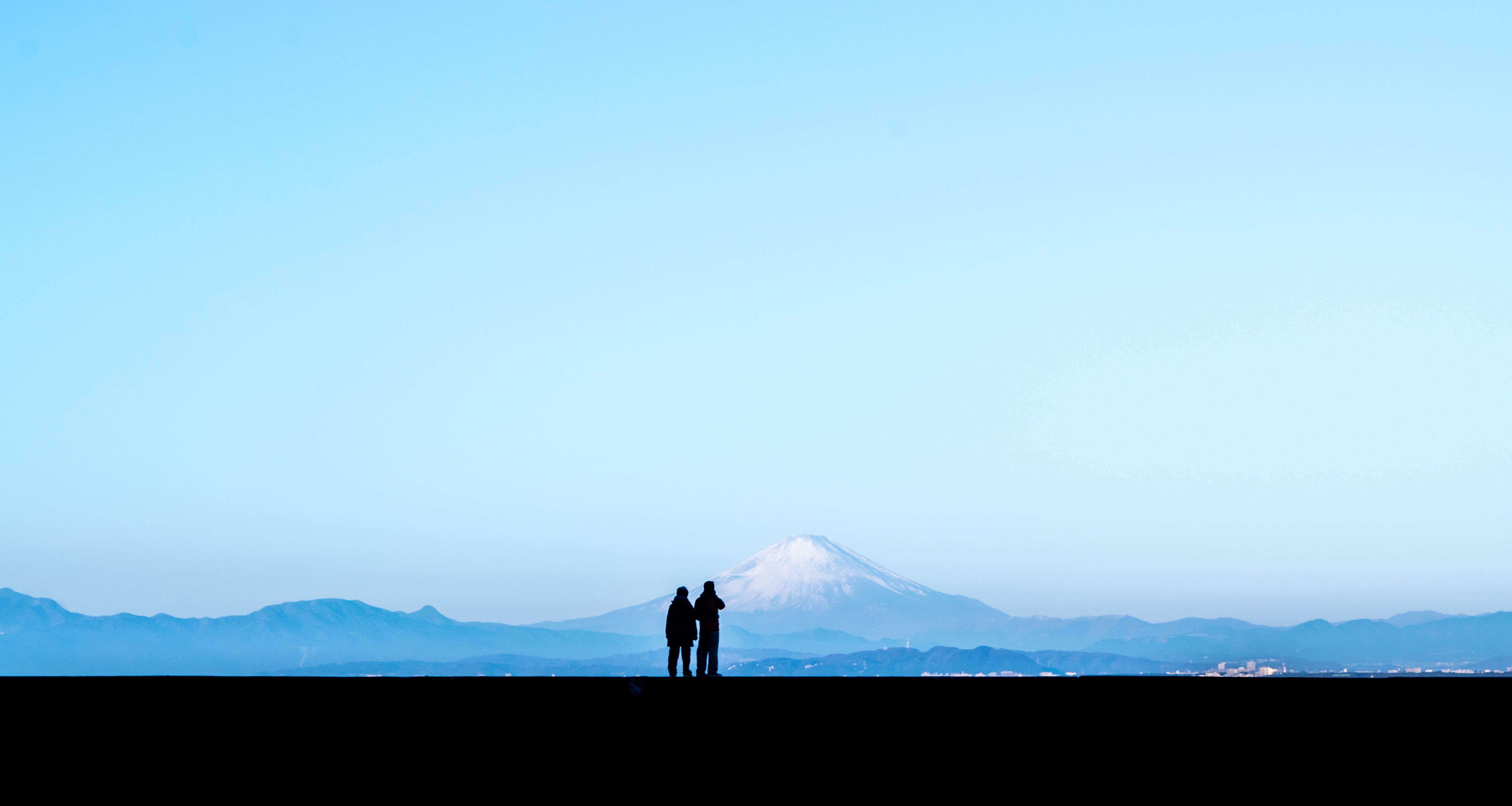 Silhouette of a Couple Viewing Mount Fuji on a Clear Day