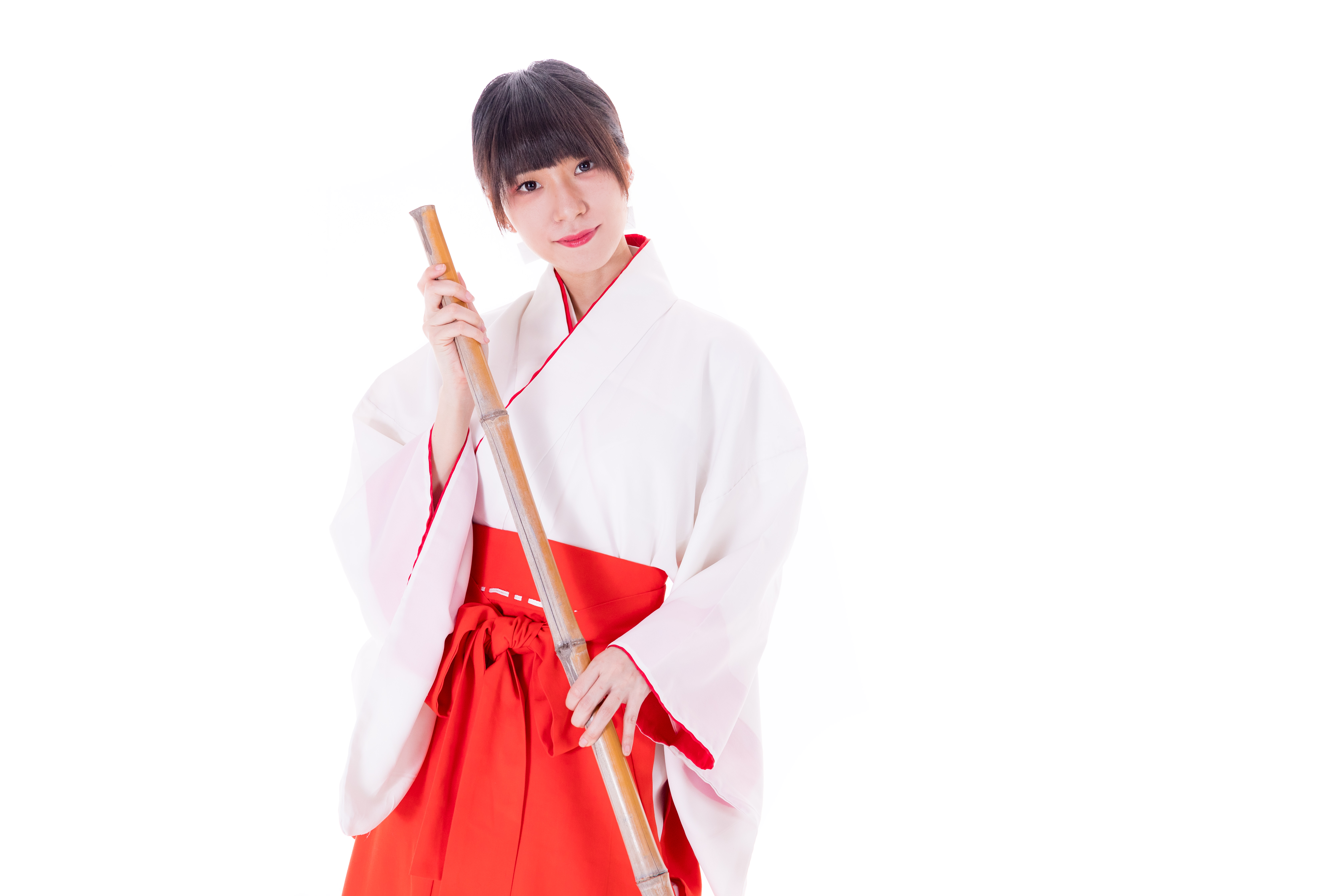 竹箒を持って掃き掃除をする巫女装束の女性の写真素材です。鶴柄の千早と赤い袴を着た全身のカットです。神社・和の行事・伝統文化を扱うコンテンツにおすすめです。