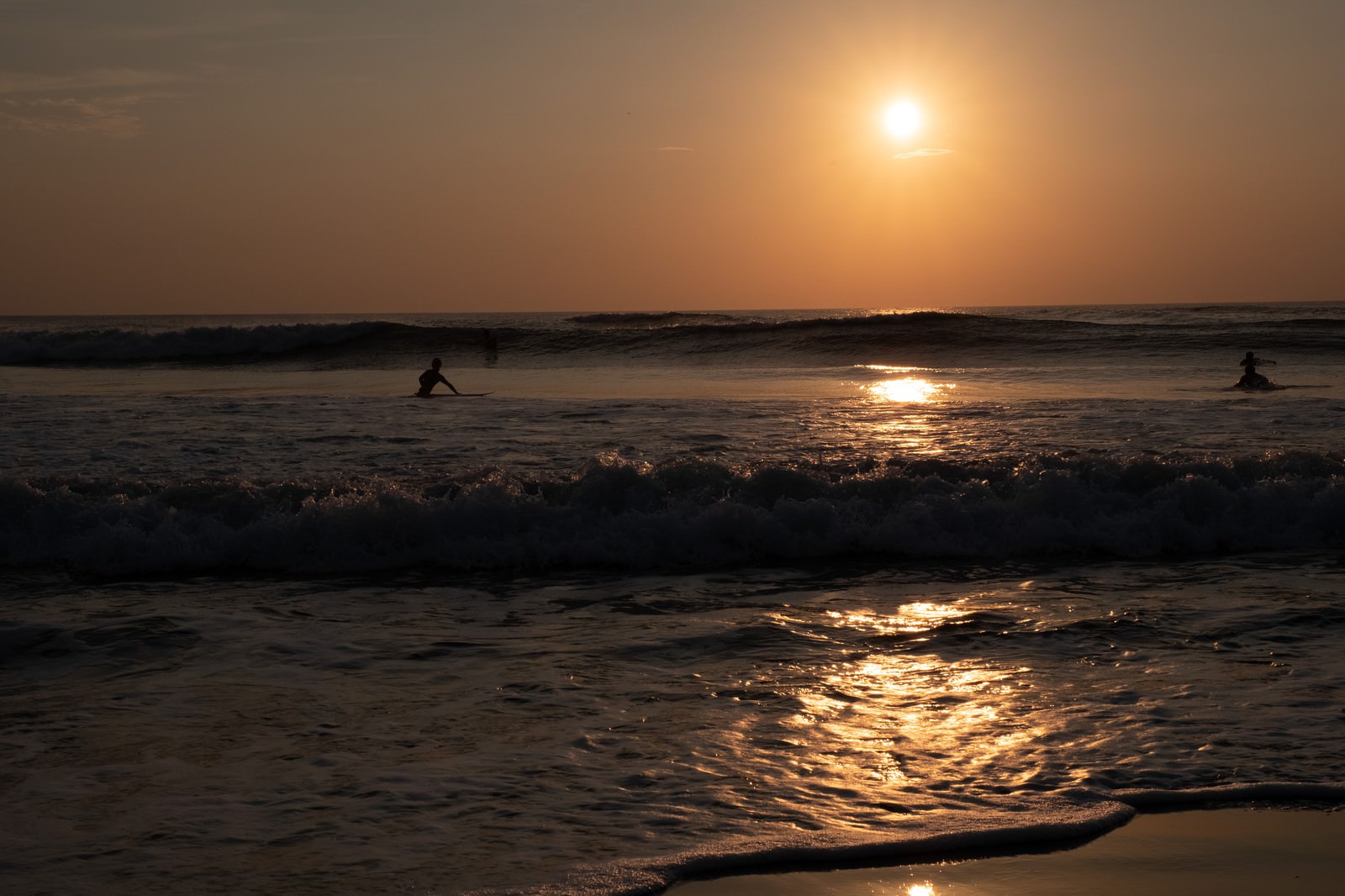 朝焼けの波打ち際に挑むサーファー達の写真素材です。千葉県一宮町の海岸で、朝日が昇る早朝に、複数のサーファーがシルエット姿で波に乗っています。朝焼けに染まった空と海が広がり、サーフィン関連のコンテンツやスポーツ写真素材として活用できます。