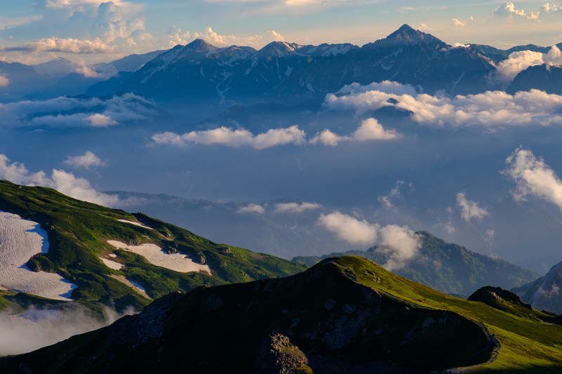霞の向こうに見える立山連峰と剱岳の写真素材です。雲海に覆われた山々の稜線が幾重にも重なり、手前から奥へと深い陰影で描かれており、北アルプスの山峰を活かした登山ルート選定や山岳地帯の自然素材として活用できます。
