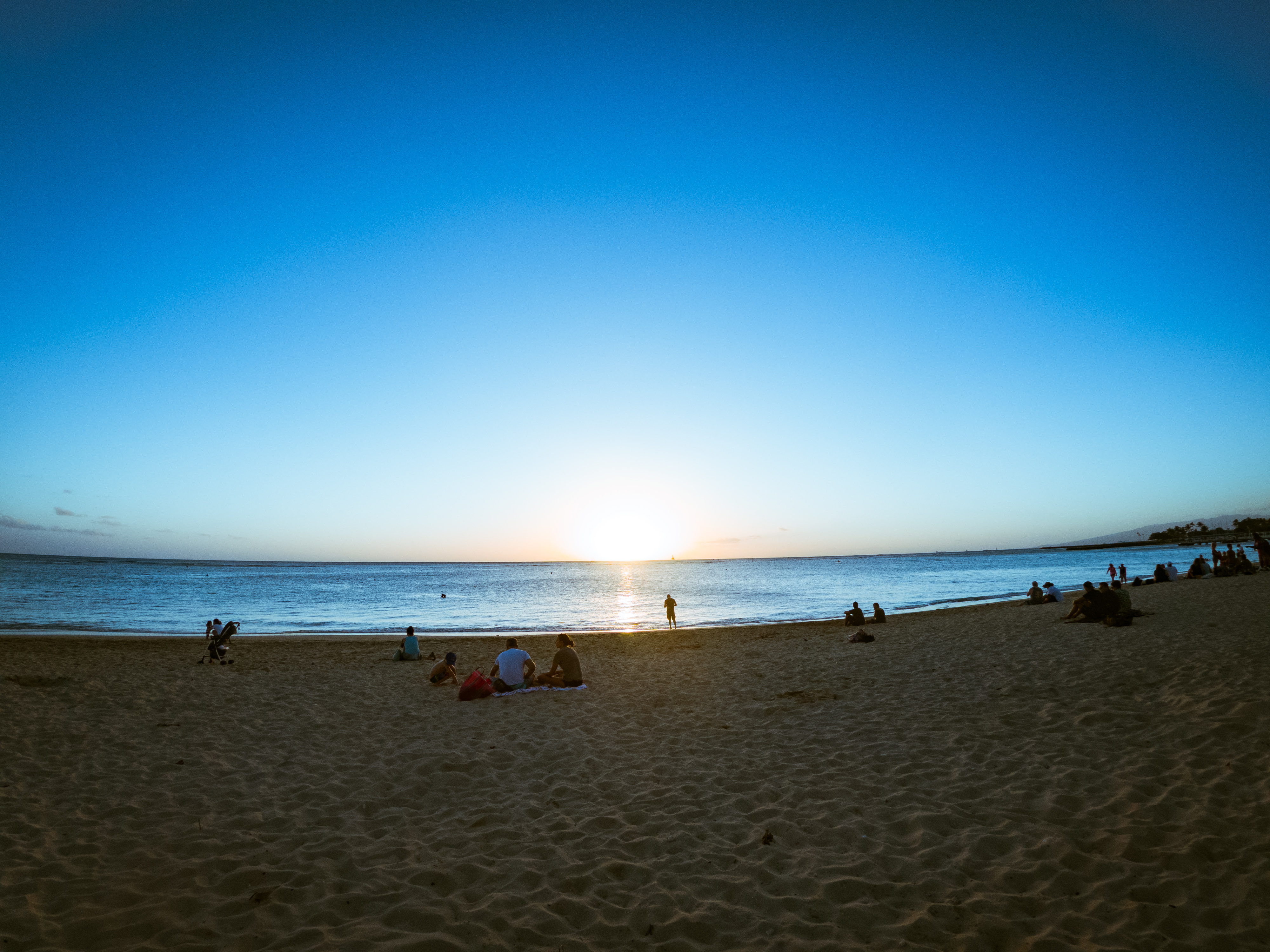 ハワイのサンセットを眺める人々の写真素材です。砂浜に座る人々のシルエットが、太陽が地平線に沈む夕焼け空と海を背景に映り込みながら、ハワイの美しい自然景観を観賞しています。ハワイの観光地素材やトラベルコンテンツ、夕焼けの風景写真として活用できます。