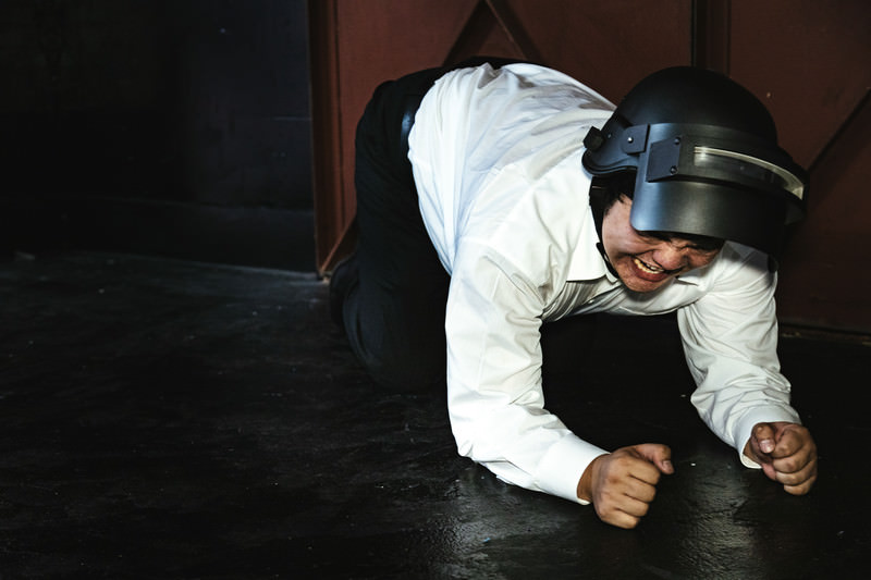 傷を負って仲間の助けを待つプレイヤーの写真素材です。白いシャツを着た男性が床に四つん這いで倒れており、ダメージを受けた状態で仲間のサポートを待っている状況が映っています。ゲーム実況動画やエンターテイメントコンテンツ、ゲーム関連の記事制作などにおすすめです。