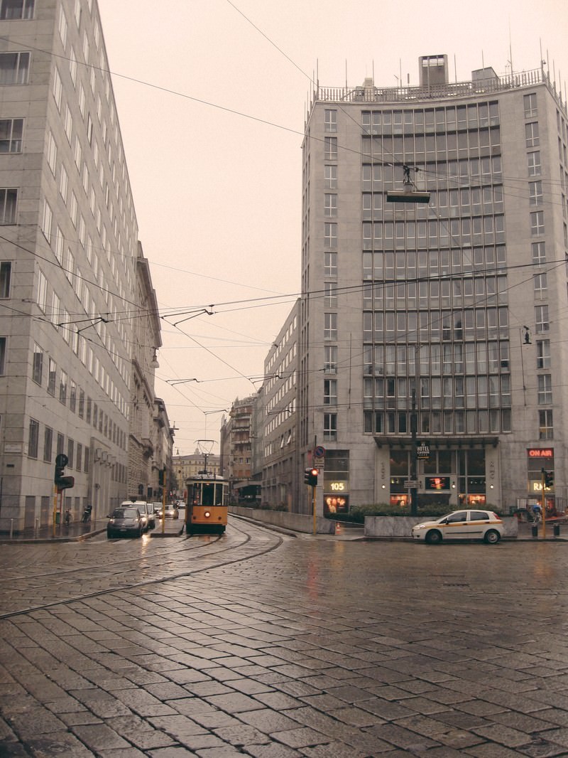 ミラノの道路を走る路面電車と街並みの写真素材です。雨に濡れた石畳の交差点を、黄色いトラムがカーブしながら進んでいます。ヨーロッパの都市や海外旅行、イタリア関連のコンテンツ制作などにおすすめです。