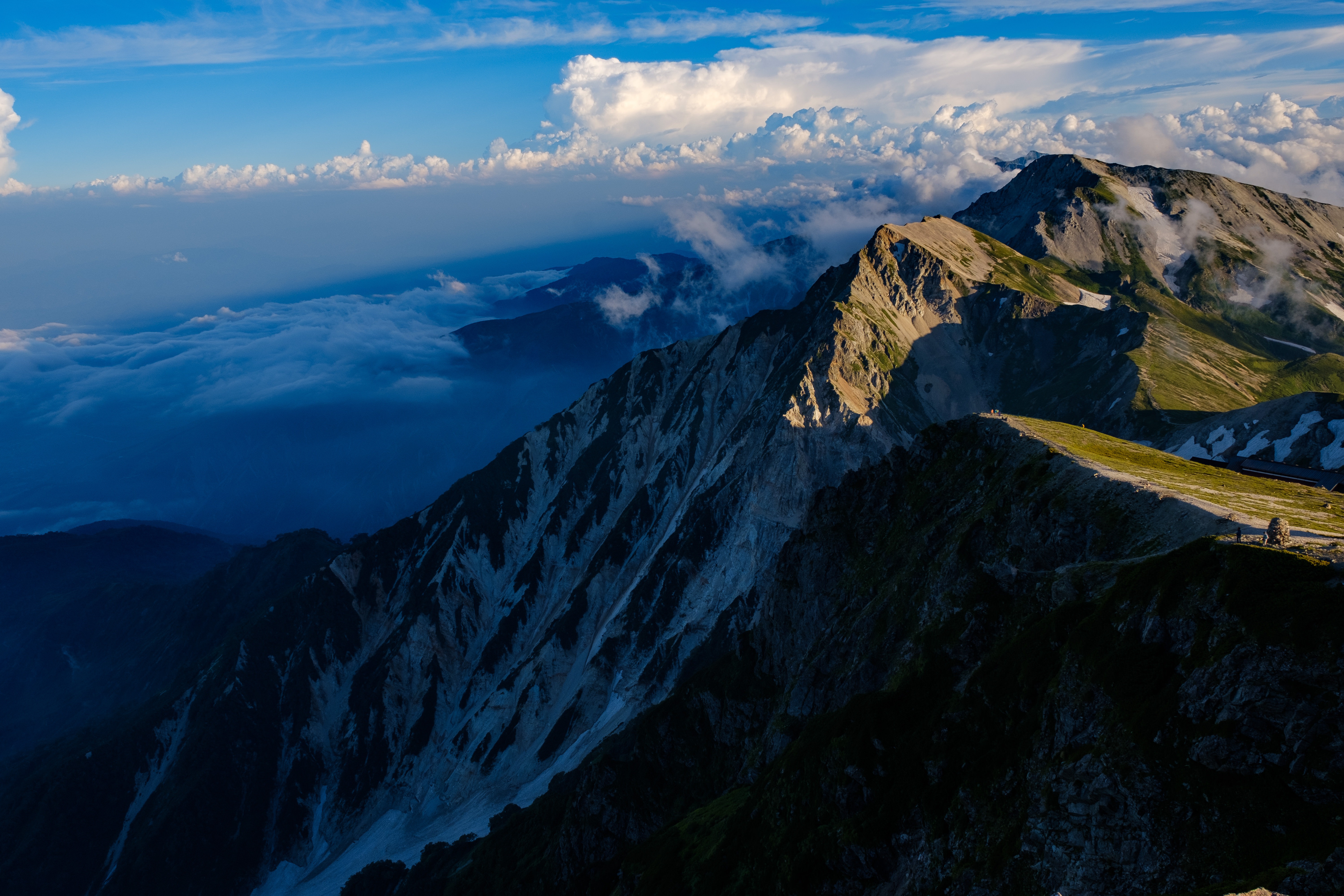 高所から見下ろした険しい岩稜と雲海の写真素材です。切り立った傾斜面と日光を受けた峰が連なり、遠方まで山々が続きます。登山・トレッキング関連のコンテンツや自然風景を扱う媒体におすすめです。