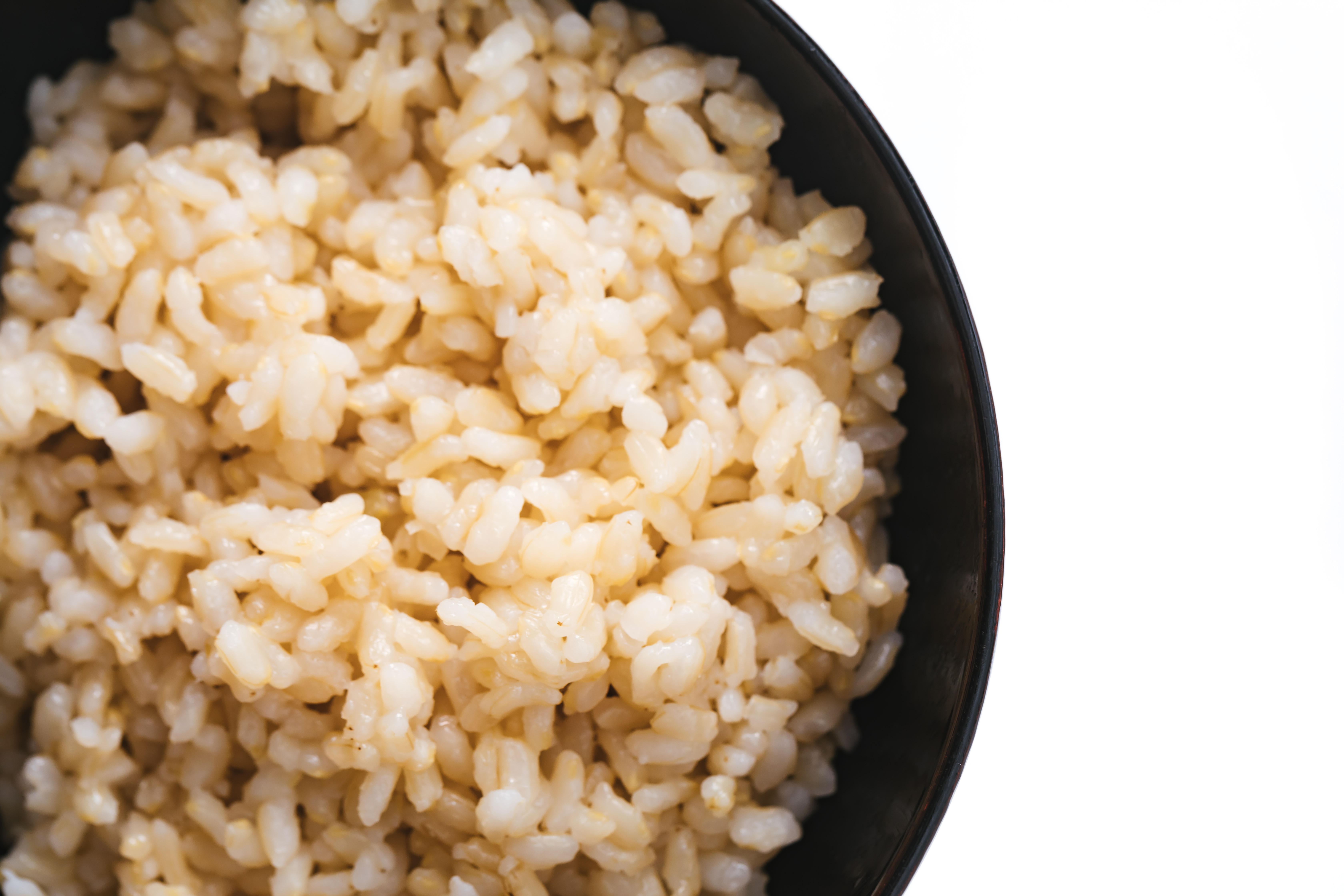 黒い茶碗に盛られた玄米の写真素材です。ふっくらと炊き上がった玄mm米が黒い茶碗に盛り付けられており、一粒一粒が立った状態に仕上がっています。栄養価に優れた玄米は、白米と比べて食物繊維やミネラルが豊富で、ヘルシーな食生活や栄養バランスを意識した食事コンテンツに最適です。