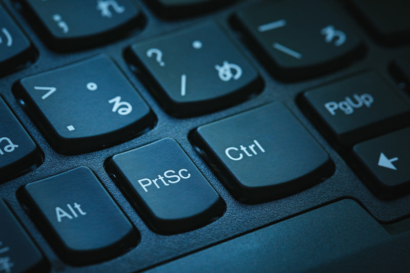キーボードのプリントスクリーンボタンの写真素材です。青い光で照らされたPrtScキーが暗めの背景に浮かび上がり、スクリーンショット機能を視覚的に表現しています。パソコン画面を画像として保存するプリントスクリーン機能は、パソコン操作の説明資料やIT関連、キーボード操作ガイドなどにおすすめです。