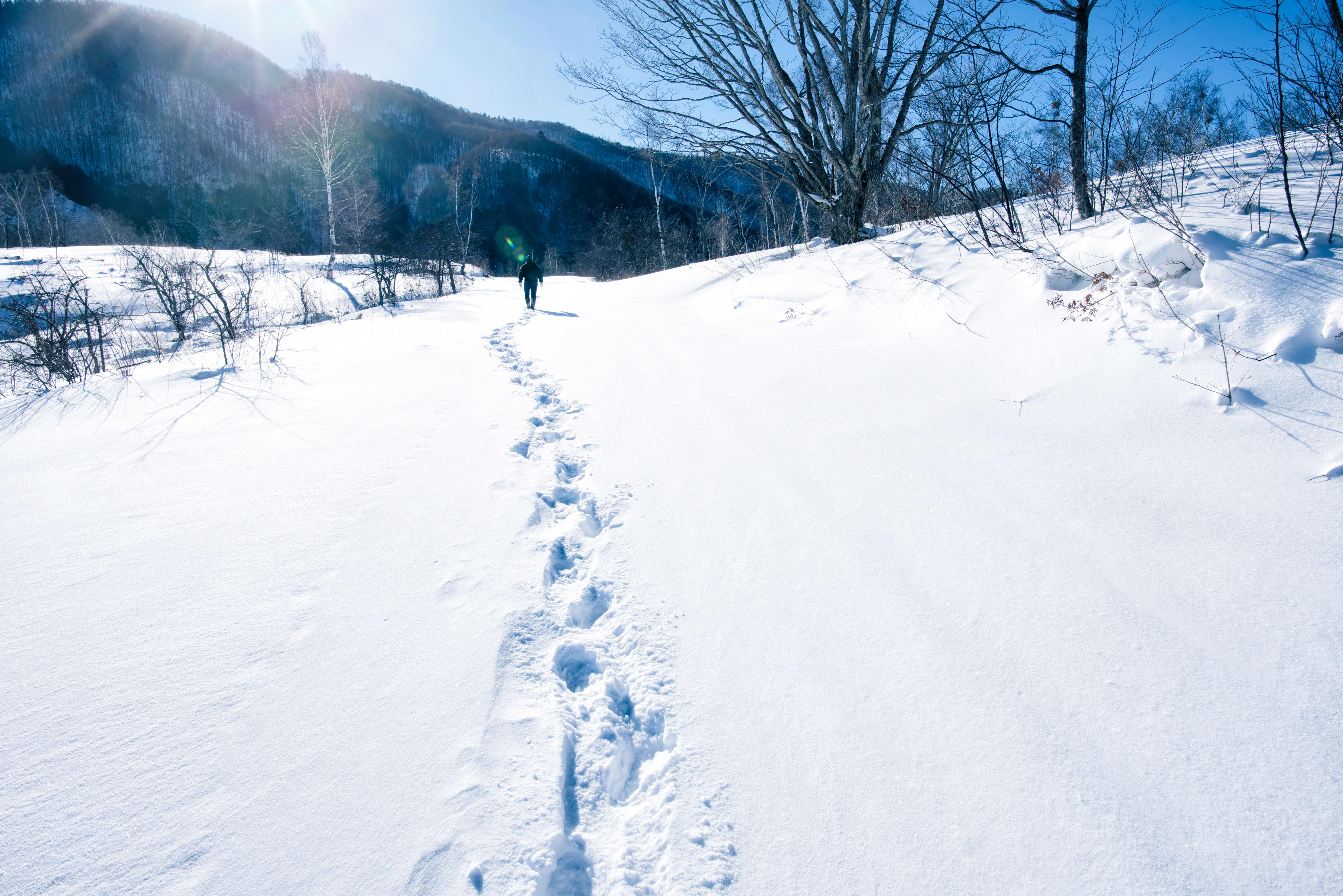 晴れた冬の雪道に続く足跡の写真素材です。真っ白な雪面に点々と続く足跡が見られ、青空の下で太陽の光が雪面を明るく照らし、残雪が輝いています。冬の風景やアウトドア関連のコンテンツ制作、ウィンタースポーツやハイキングの素材としておすすめです。