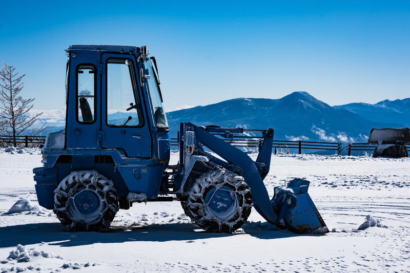 雪原に停車した除雪車の写真素材です。青空の下、雪に覆われた平原に青い除雪車が止まっており、タイヤとチェーンで雪道対応した様子が確認でき、背景には雪化粧した山々が連なっています。冬の道路管理や除雪作業の素材におすすめです。