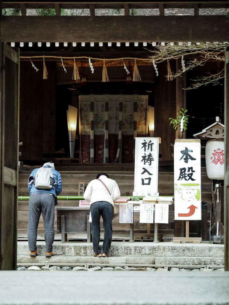 Worshipers praying at Ujigami Shrine
