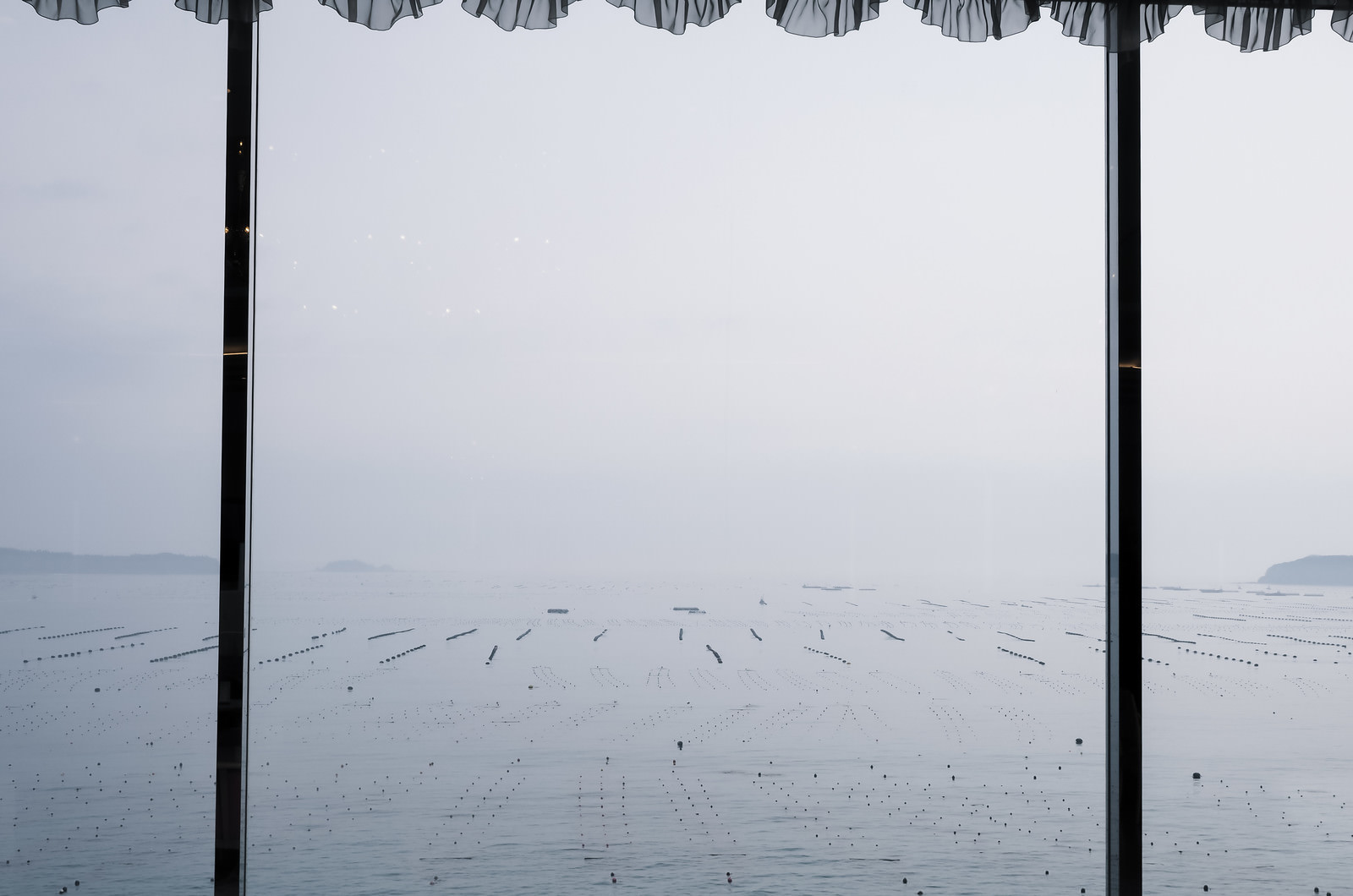 窓越しに見る志津川湾の写真素材です。窓枠の向こうに広がる志津川湾の穏やかな湾内に、養殖用の多数の浮きが点在し、遠景には港の建物や岸辺の風景が見えています。海の風景や漁業関連、地域の景観素材として活用できます。