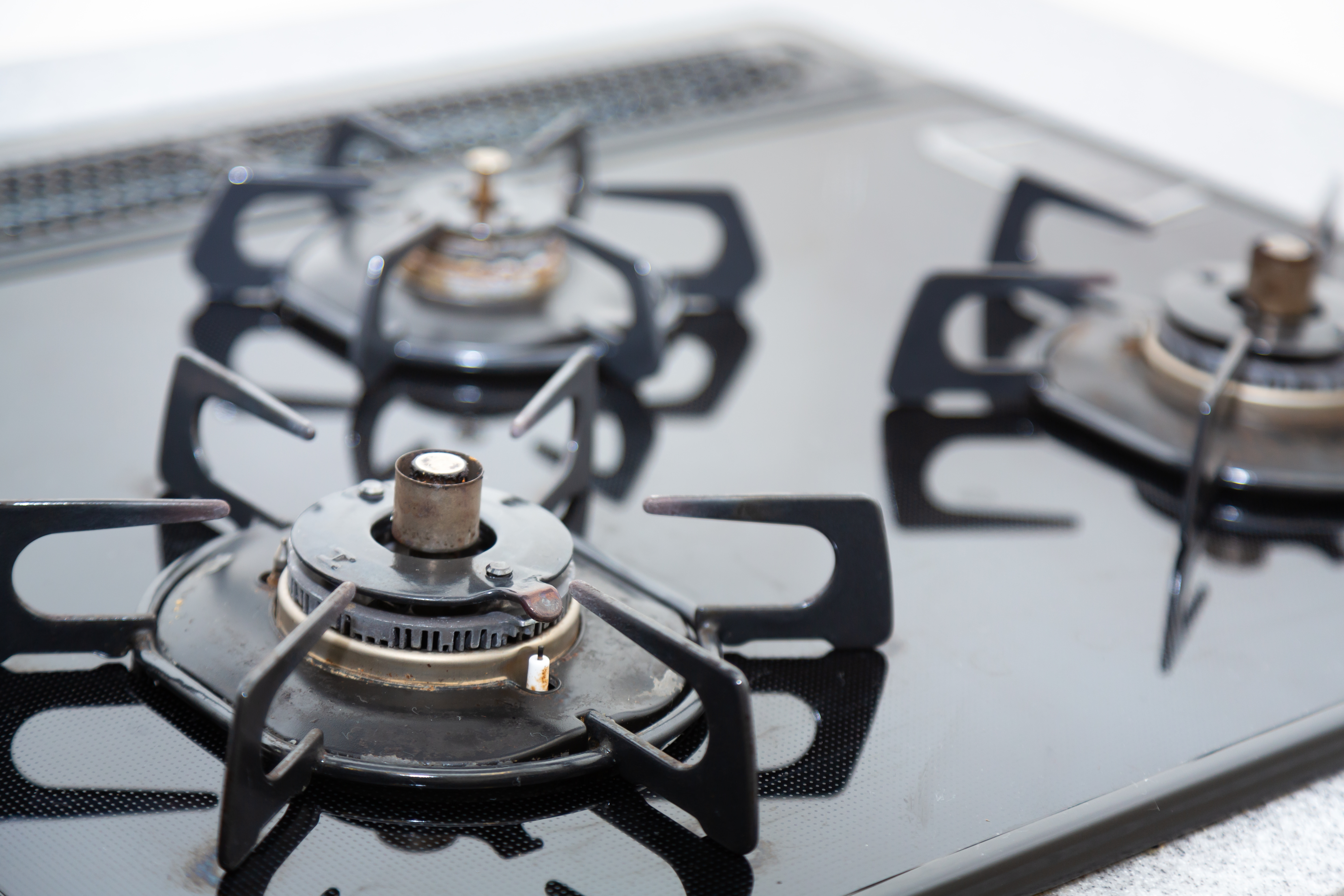 ステンレス製の3口ガスコンロの写真素材です。銀色の本体に黒い五徳が3つ配置され、中央と両側のバーナーがそれぞれ異なるサイズになっており、強力な炎で火力調整も可能です。料理や調理関連の記事、キッチン設備の紹介、レシピサイトなどにおすすめです。