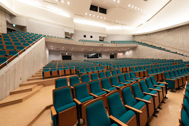 とぎつカナリーホールの座席の写真素材です。緑色の座席が整然と並ぶコンサートホール内部で、2階席から見下ろした角度で撮影した風景です。音楽イベントや演奏会、文化施設の紹介や地域情報サイト、コンサートホール関連のコンテンツ制作などにおすすめです。