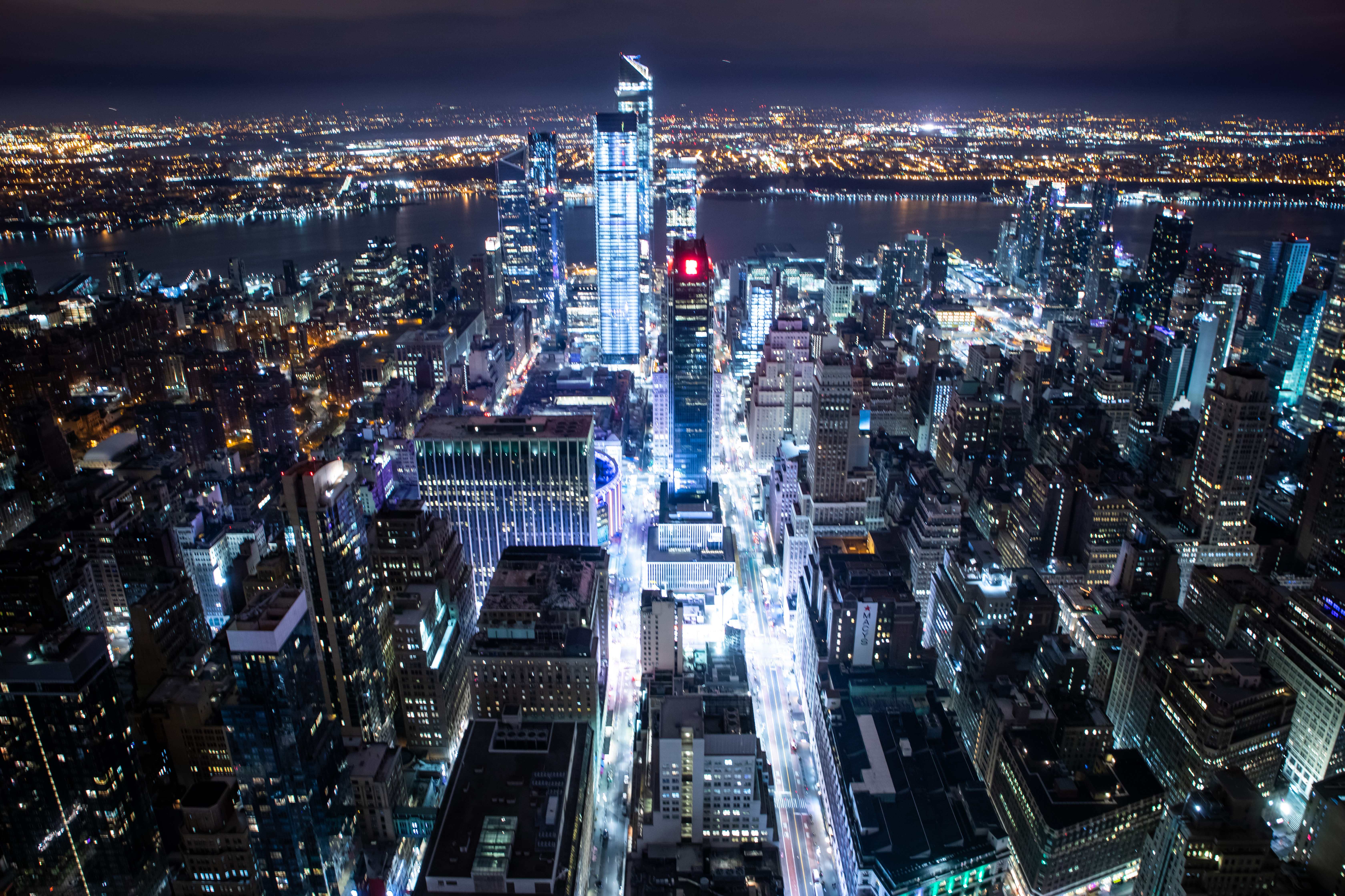 ニューヨーク・マンハッタンのスカイラインを高所から広角で撮った夜景の写真素材です。中央の超高層タワーと、手前から奥へ続く大通りの街明かりが印象的です。都市イメージや旅行・ビジネス関連のデザインにおすすめです。