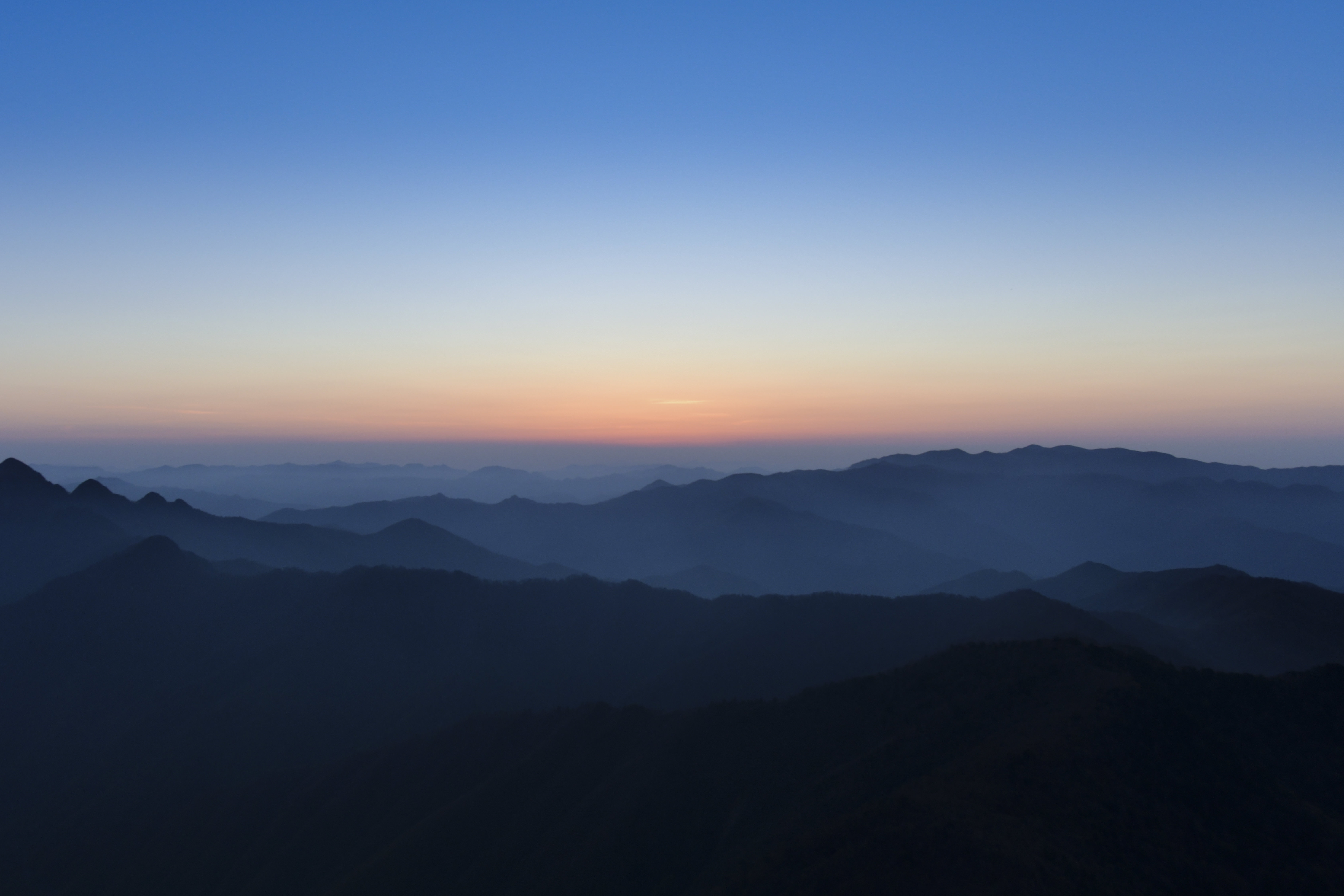 大台ヶ原から望む早朝の近畿の連峰を撮影した写真素材です。空はオレンジからブルーへ変わり、朝霧の中に山々のシルエットが何層にも重なっている。登山ブログや自然風景のコンテンツ制作などにおすすめです。
