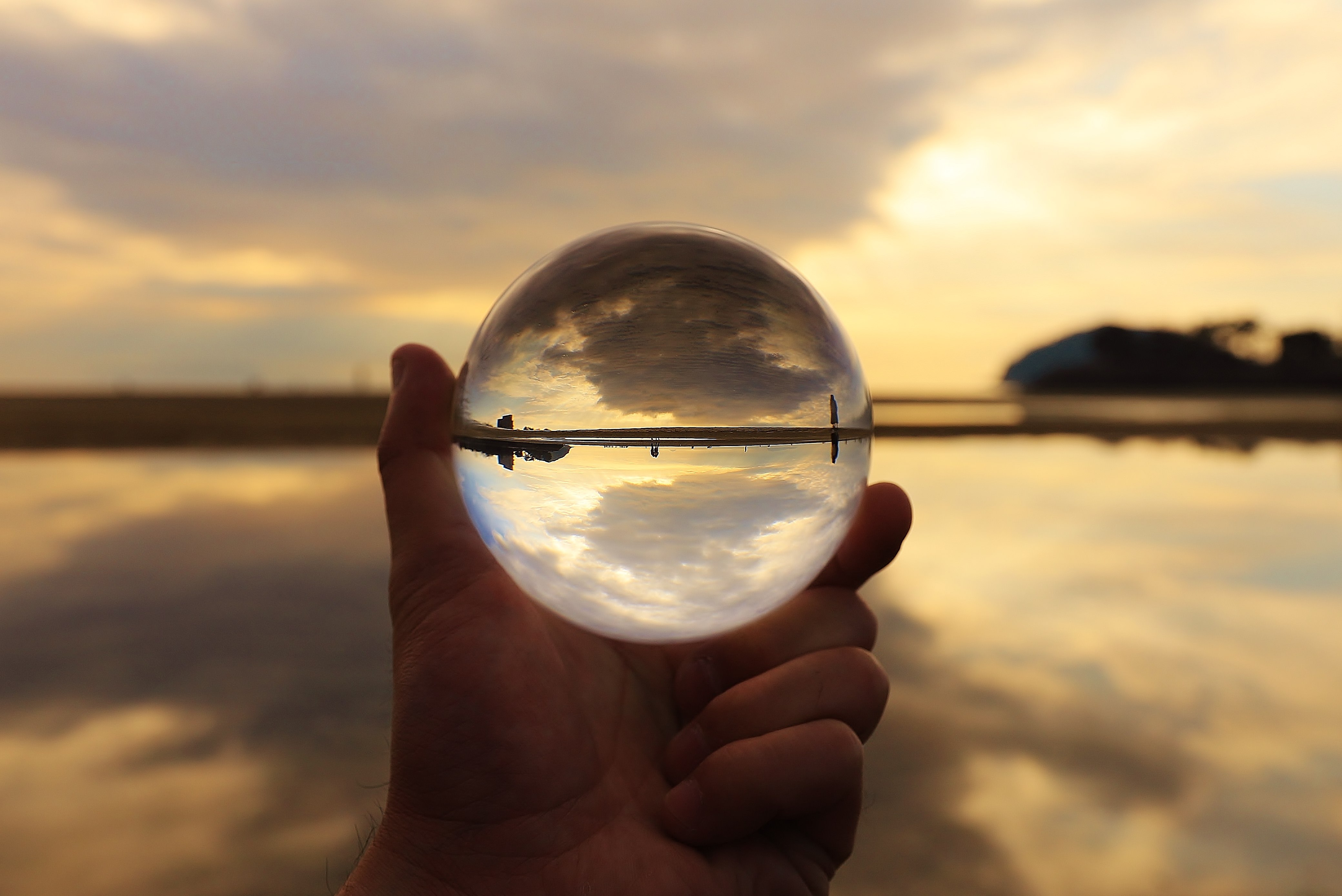 英語のページ:Glass Sphere Capturing Coastal Scenery