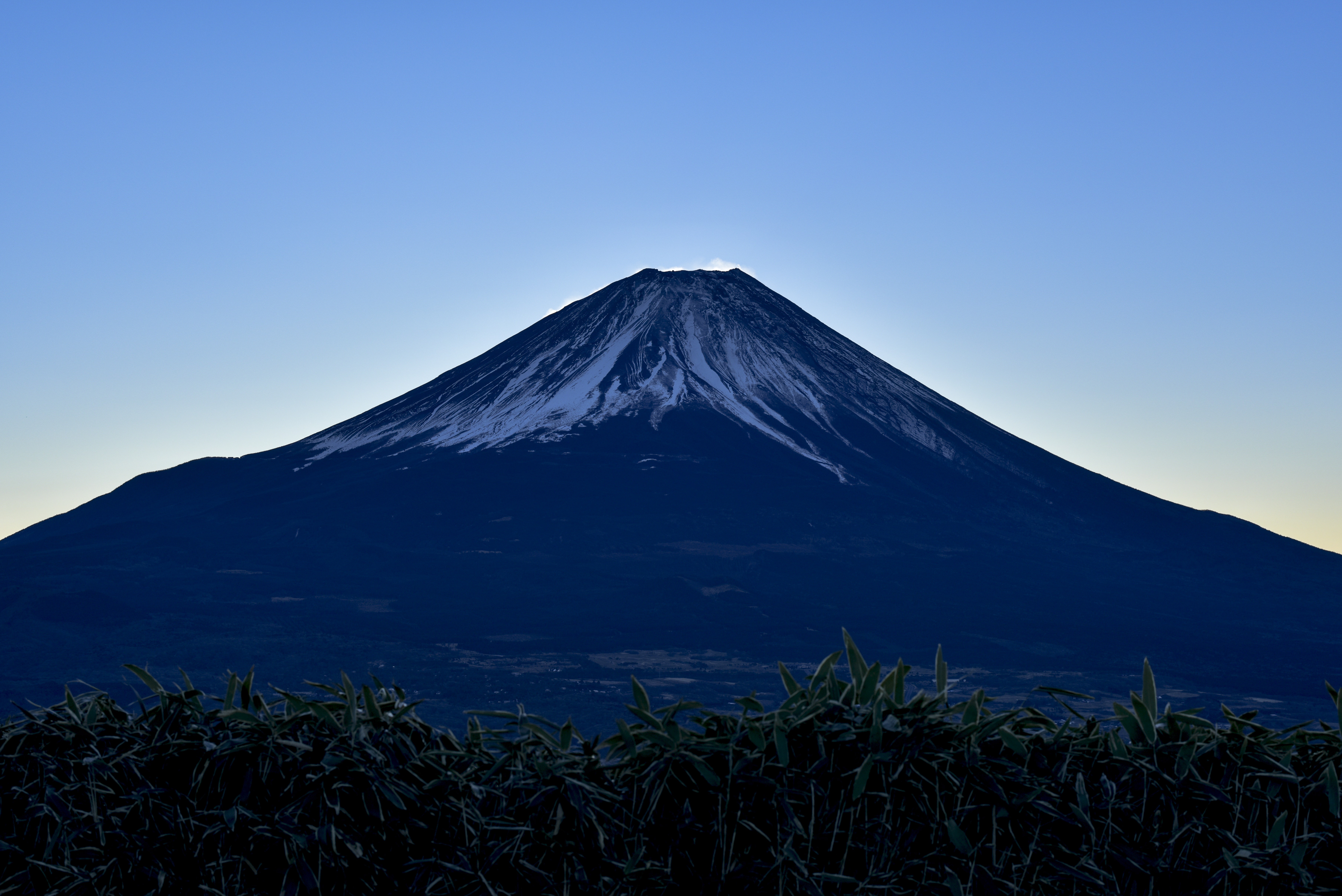 薄明の空の下、雪をまとった富士山のシルエットが浮かぶ夜明けの写真素材です。手前には植物の葉が広がり、山全体がくっきりと写っている早朝の静かな風景です。観光案内や壁紙、旅行パンフレットなどにおすすめです。