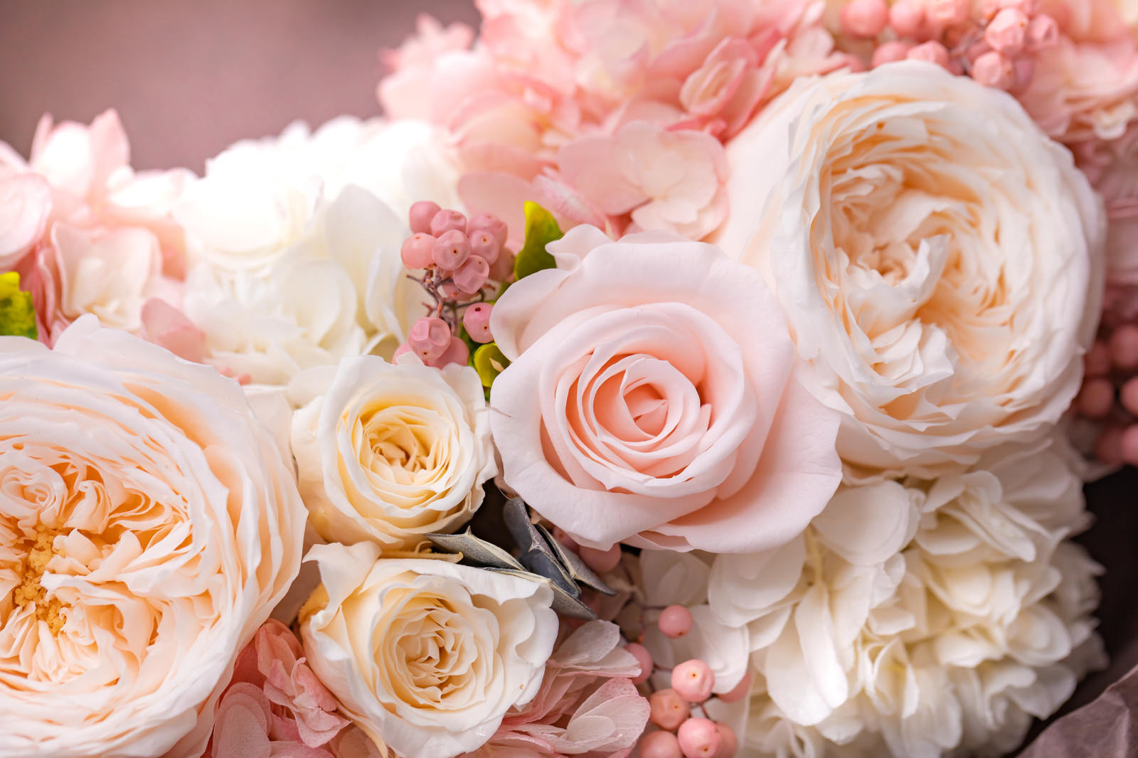 ピンクと白のバラを中心とした花束の写真素材です。淡いピンクの薔薇と白いバラが組み合わせられており、プリザーブドフラワーを使用しているため長期間にわたって美しさを保つ上品な作品となっています。結婚式やお誕生日、お祝いのシーンなどにおすすめです。