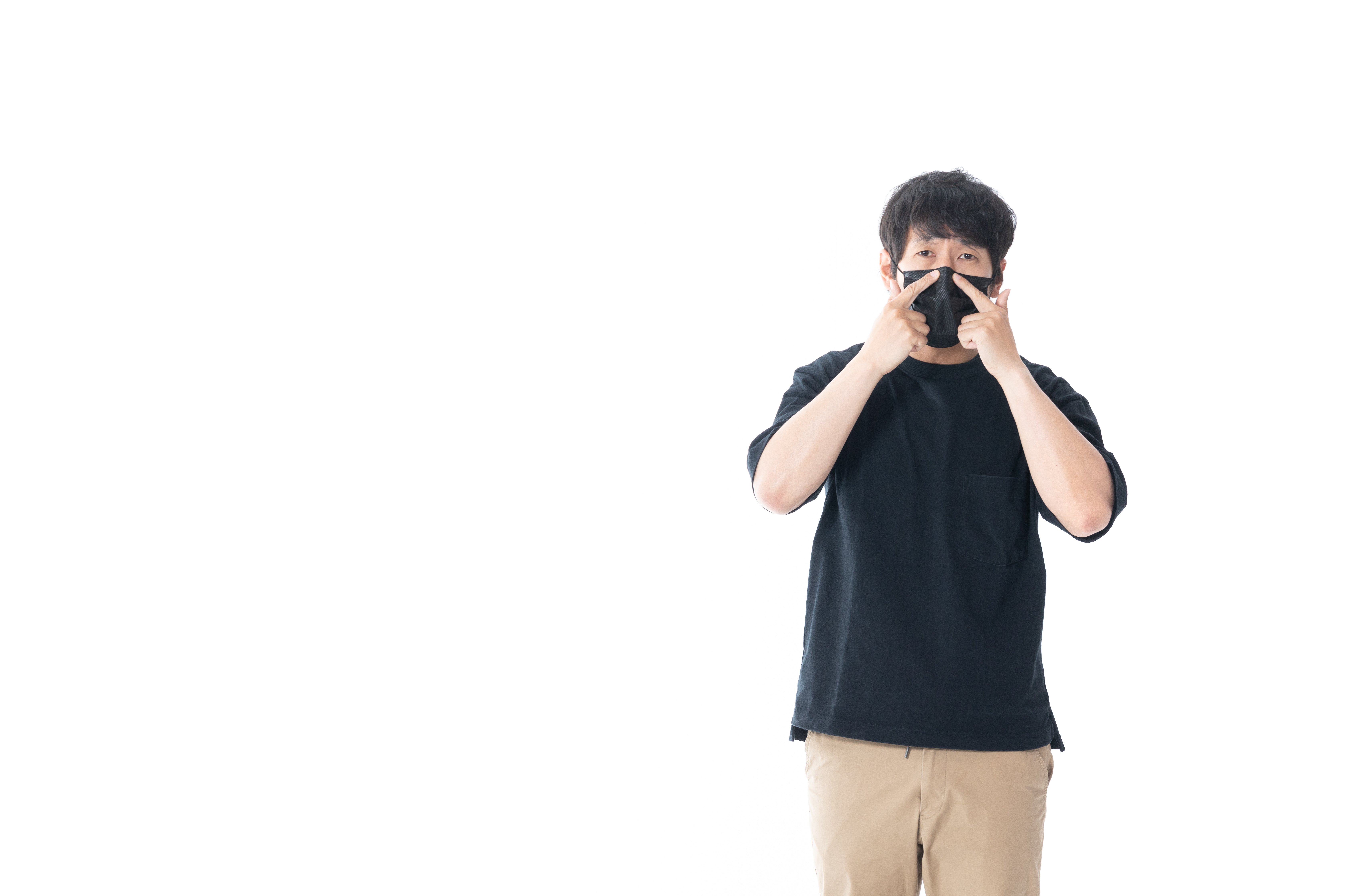 黒マスクを着用した男性の写真素材です。両手でマスクの鼻の部分を調整しており、黒いトップスとベージュのパンツを着用している様子が捉えられています。感染症対策や花粉症対策、風邪予防、コロナウイルス対策などマスク関連の記事制作におすすめです。