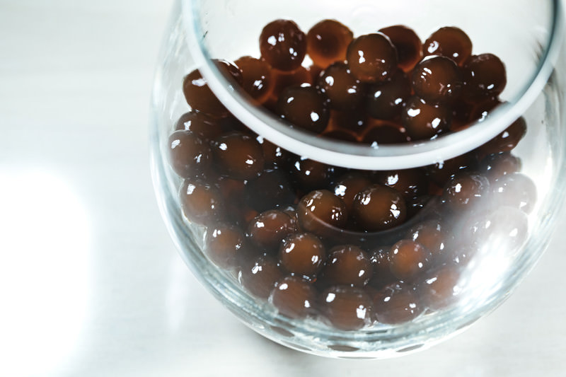 グラスに入ったタピオカの写真素材です。透明なグラスの中に茶色いタピオカパールがたくさん入っており、丸い粒状の形がはっきりと見えます。タピオカはキャッサバから採取したデンプンを球形に加工した食材で、冷たいドリンクとの相性が良く、カフェメニューや食材紹介におすすめです。