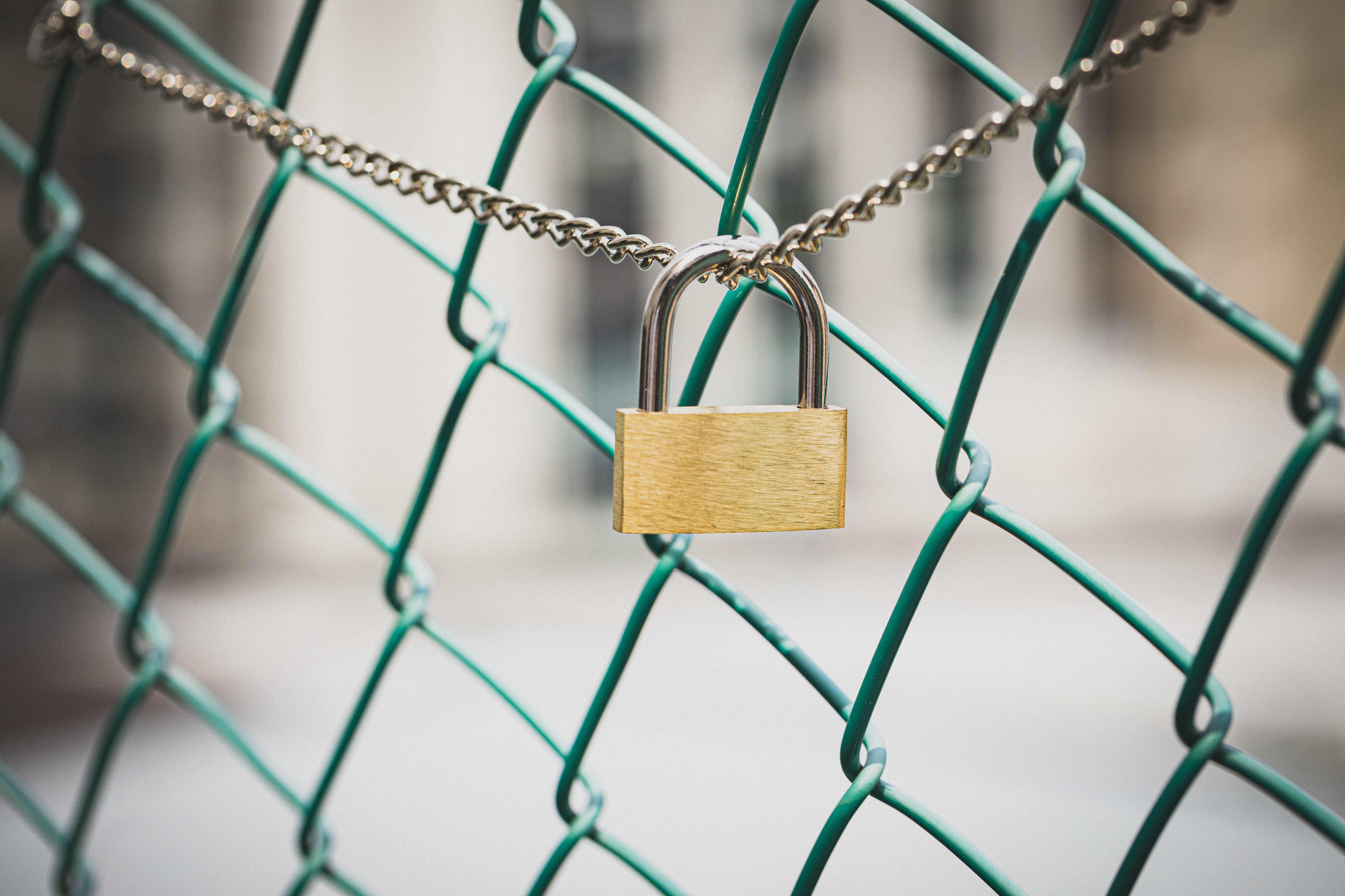 南京錠とフェンスの写真素材です。緑色のチェーンリンクフェンスに銀色のチェーンで取り付けられた金色の南京錠を接写した画像で、金属製の鍵部分と四角形の錠前本体が鮮明に映り、背景は白くぼかされています。セキュリティ・防犯対策、プライバシー保護、アクセス管理、デジタルセキュリティのメタファー表現など、情報資産の保護や安全管理に関するコンテンツにおすすめです。
