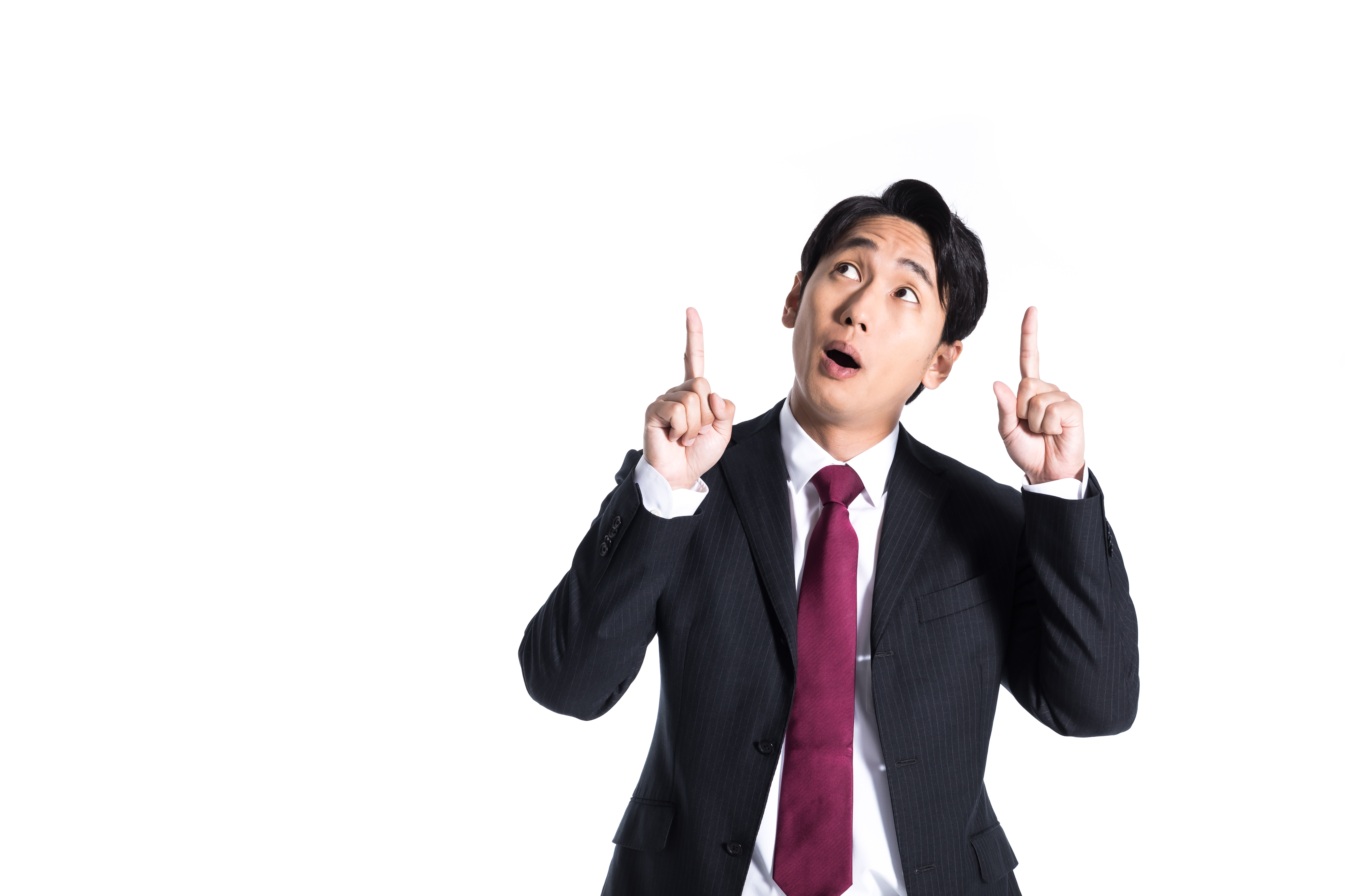 驚いた表情で上方向を指さすスーツ姿の男性の写真素材です。紫のネクタイを着用し、目を見開いて両腕で上を指差しており、背景はシンプルな白色です。口コミサイトやレビューバナー、商品紹介ページ、ビジネス関連のコンテンツ制作におすすめです。