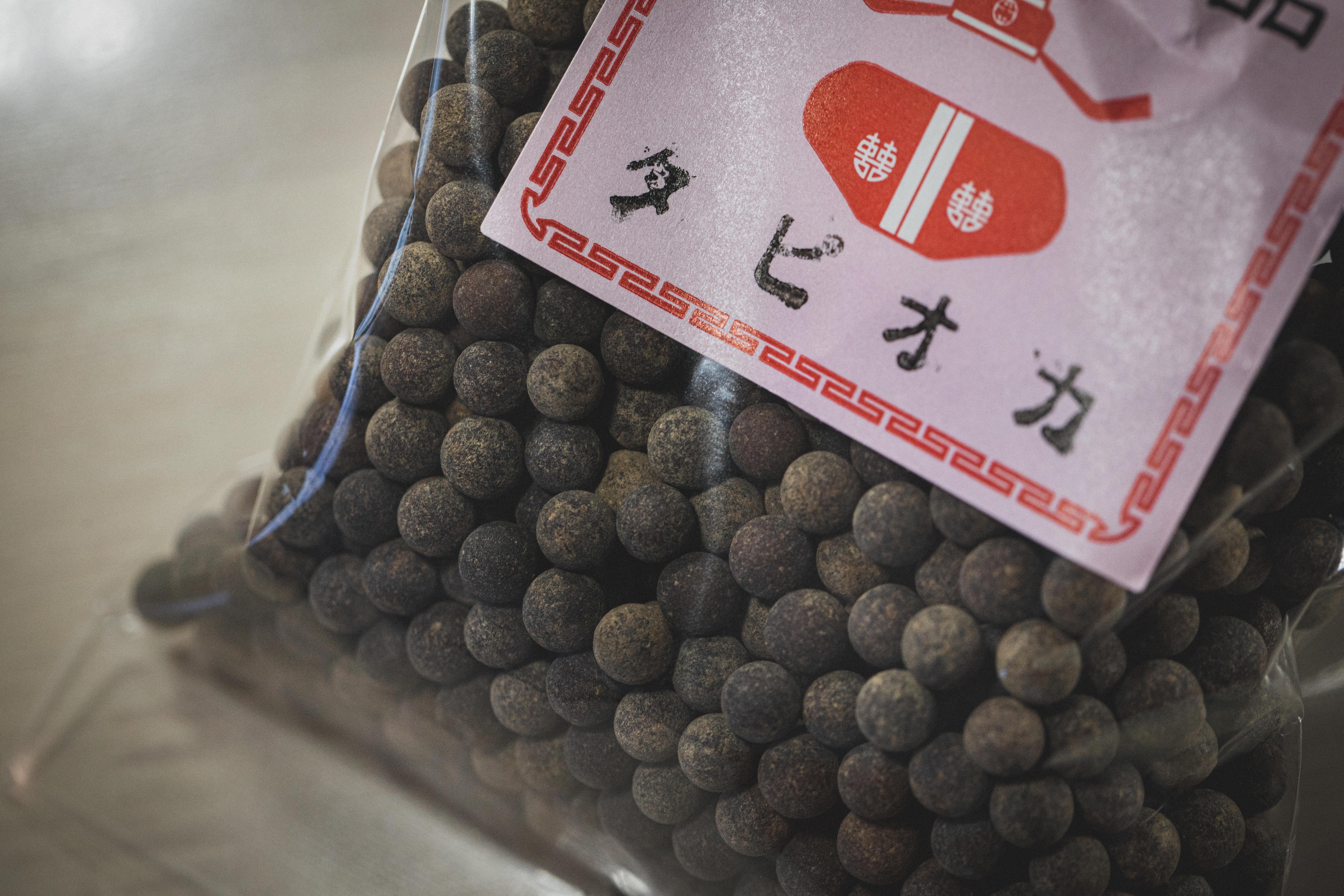 Black Tapioca Pearls in a Bag with Red Label