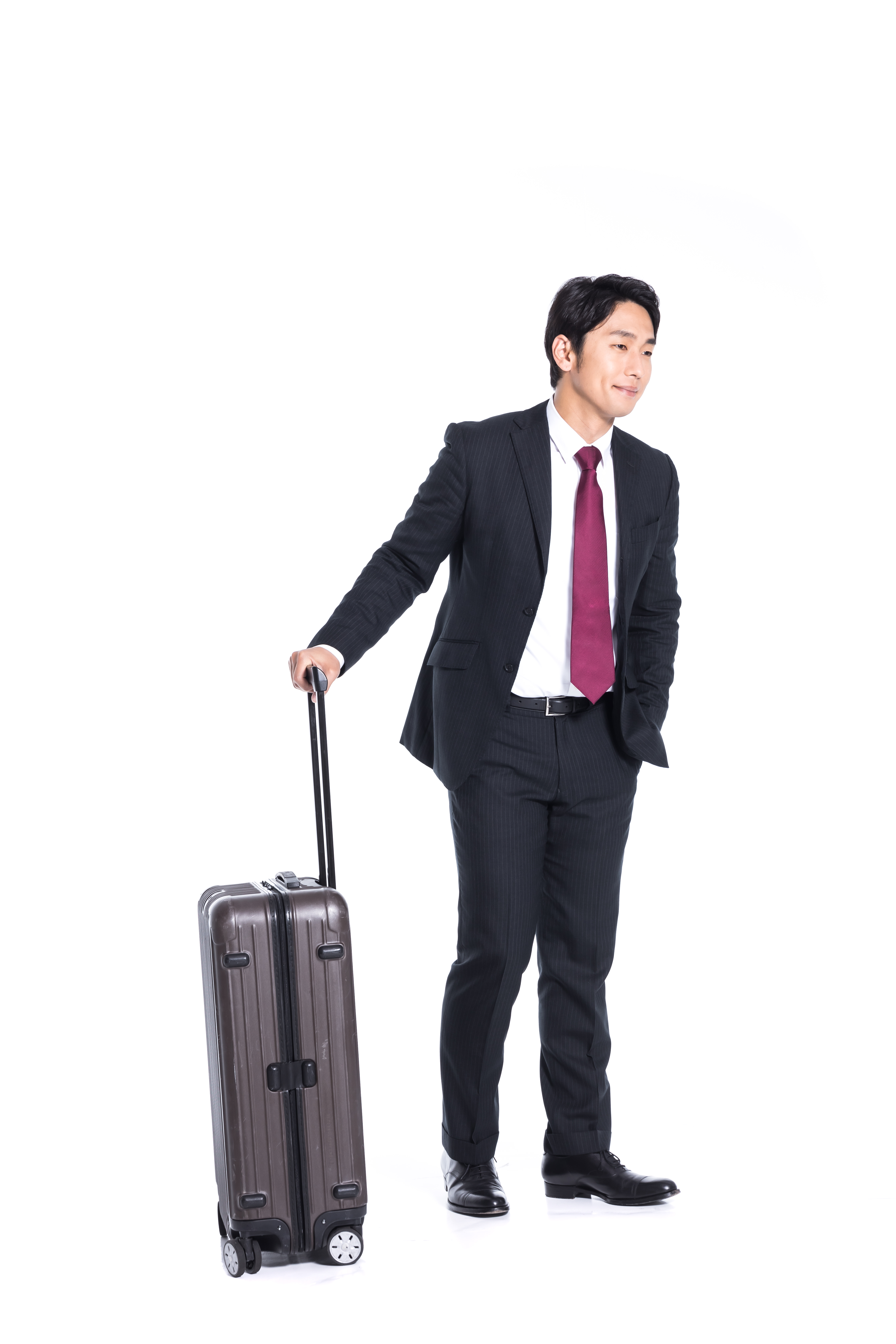 スーツケースを片手に立つビジネスマンの写真素材です。黒いスーツを着た男性が黒いキャリーケースを片手に持ち、出張や移動に向かう忙しい様子を表現しています。企業サイトやビジネス関連のコンテンツ制作、旅行業界のWebサイトなどにおすすめです。