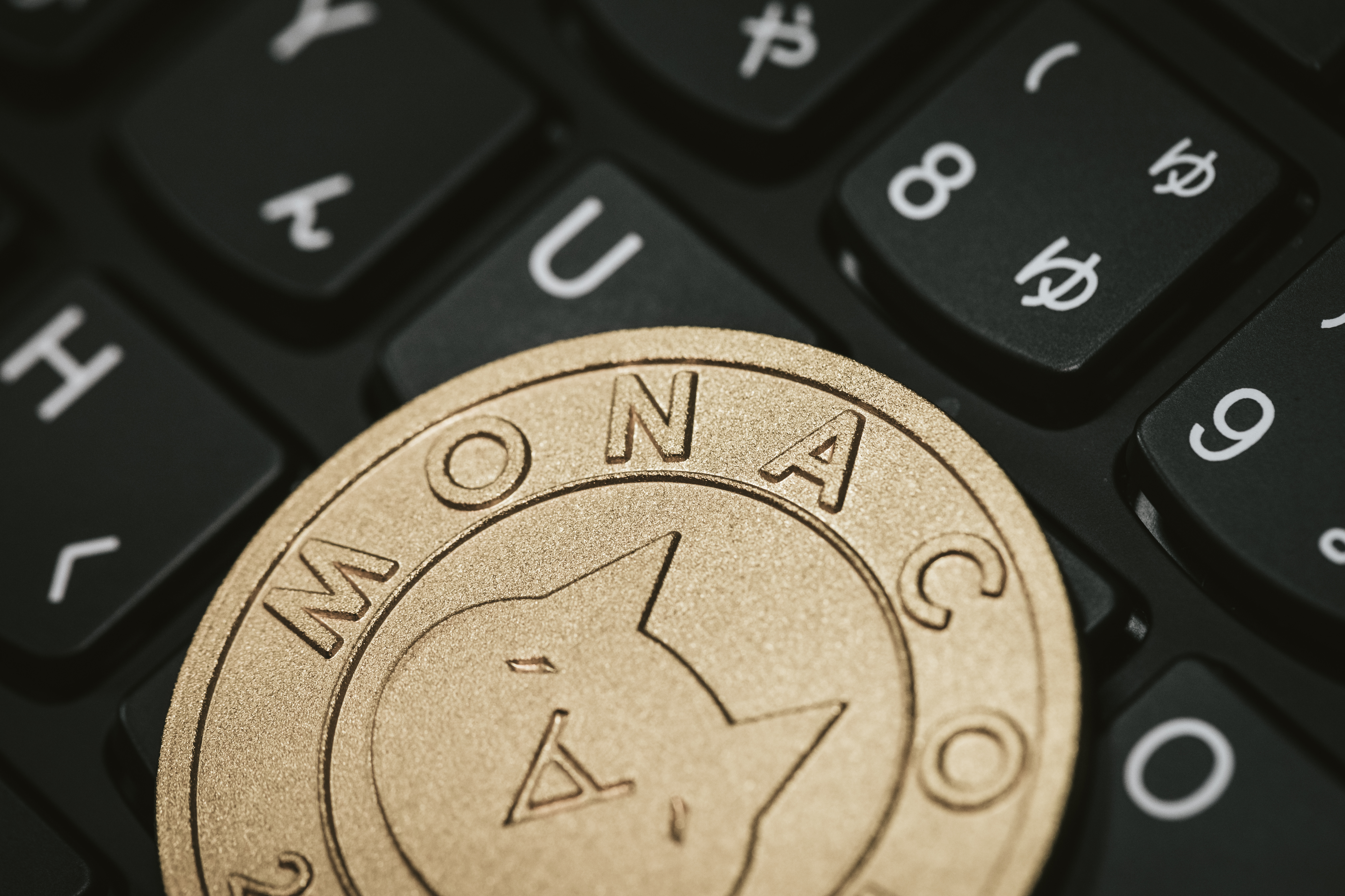 キーボードの上に置かれたモナコインの写真素材です。黒いキーボードの上に金色のモナコインが並んで、文字やロゴが鮮明に写っており、仮想通貨取引やブロックチェーン関連のビジュアルとして活用できます。金融記事やブログ、投資・暗号資産に関するコンテンツ制作などにおすすめです。