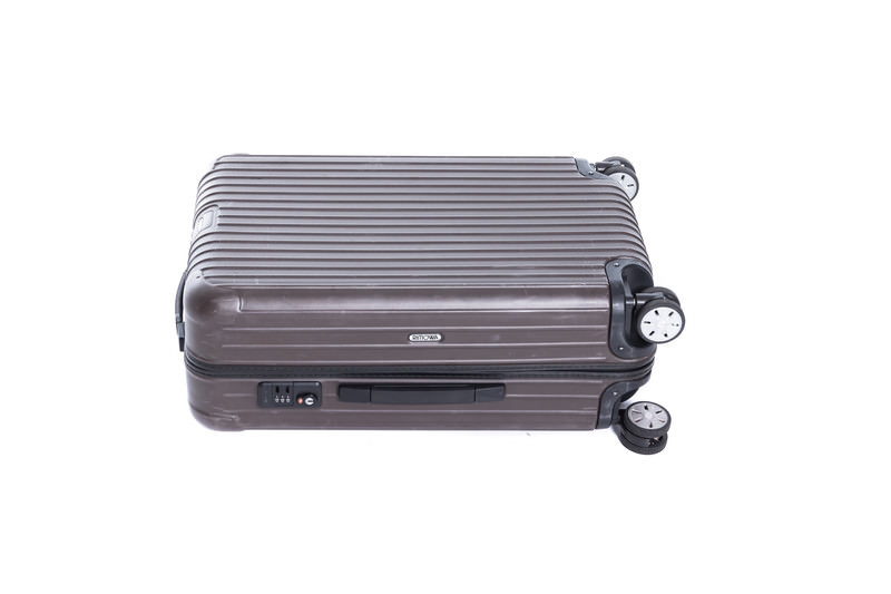 グレーのスーツケースの写真素材です。シンプルなデザインのハードタイプで、キャスターとハンドルが付いたトランク型のキャリーケースを床に置いた状態を撮影しています。旅行や出張の記事、トラベル関連のWebサイト、荷物準備の手順説明などにおすすめです。