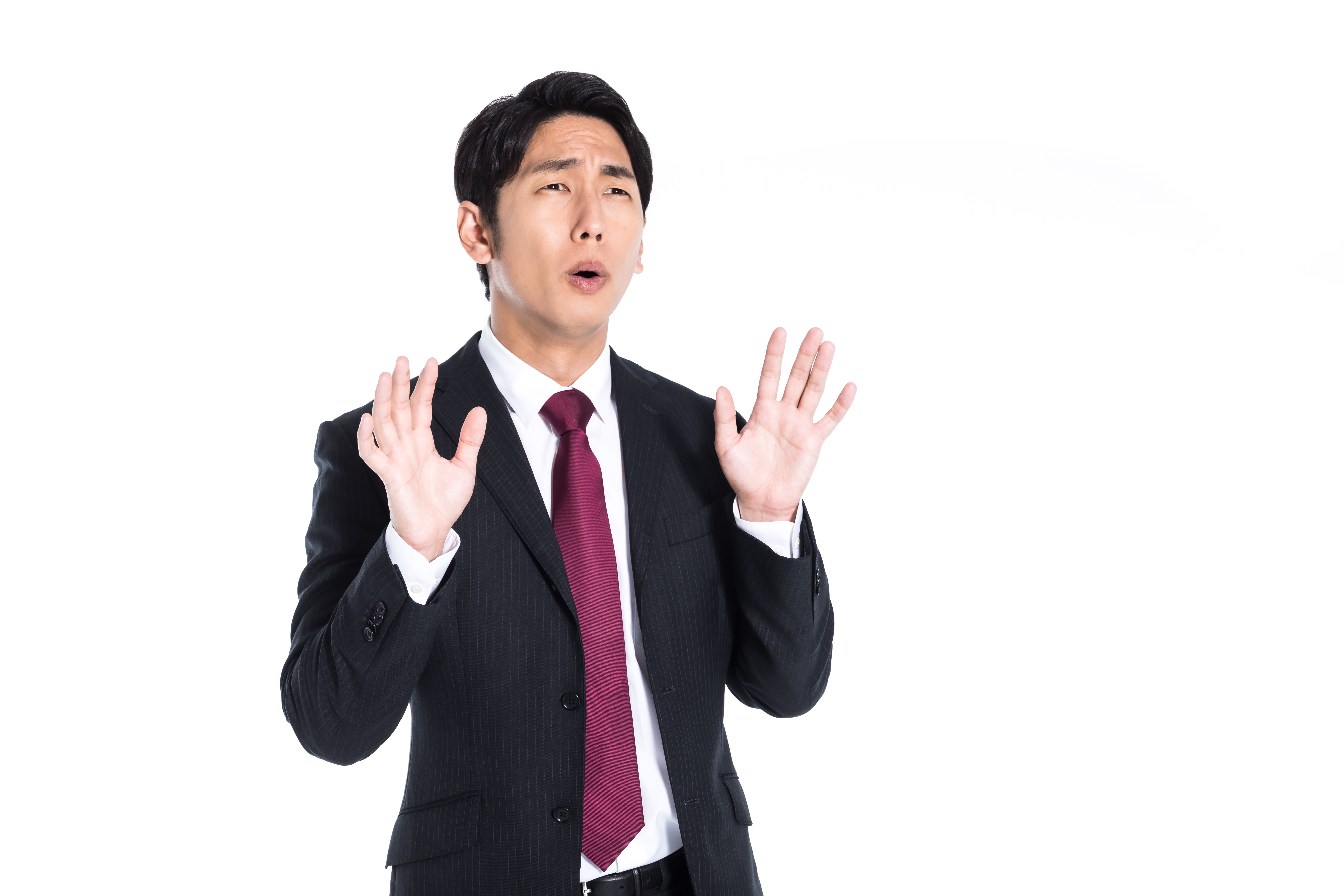 お手上げポーズで唖然とするスーツ姿のビジネスマンの写真素材です。両手を顔の横に広げ、口を開けた驚きの表情が強調されています。クレーム対応・予想外のトラブル・困惑する場面の記事やバナーにおすすめです。