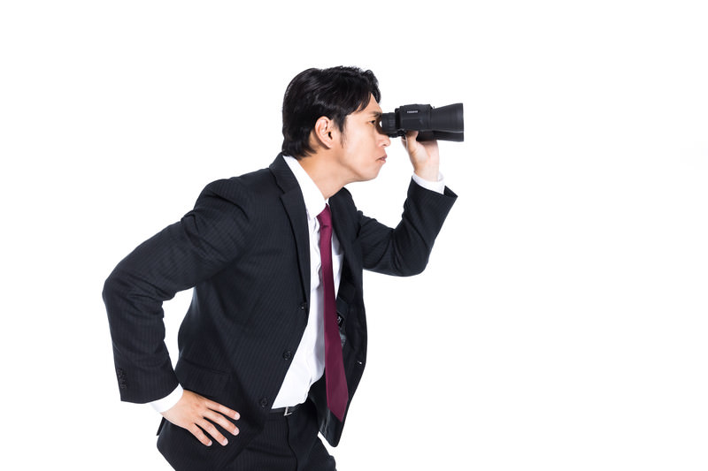 スーツを着た男性が双眼鏡を覗いている写真素材です。黒いストライプスーツとえんじ色ネクタイを着た男性が、両手で双眼鏡を構えて目に当て、横向きで遠くを監視する姿勢をしています。マーケティング資料や競合調査、ビジネスリサーチ関連のコンテンツなどにおすすめです。