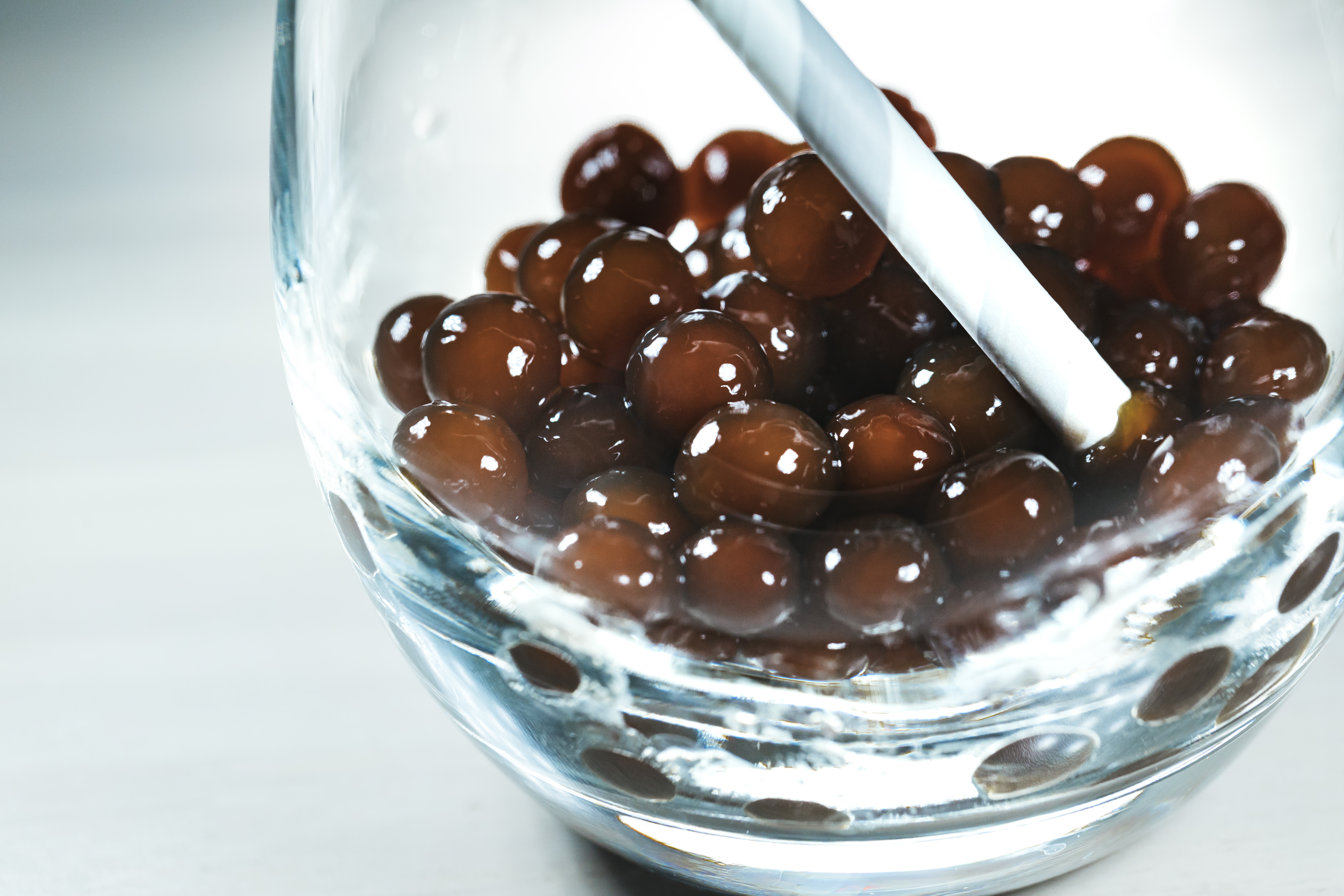 ガラス容器に沈殿したタピオカの写真素材です。透明なガラス容器の底に黒く光沢のあるタピオカが沈み、白いプラスチック製スプーンが立てかけられ、液体の中と上部には白い気泡が浮かんでいます。メニュー表示やレシピサイト、飲食店のコンテンツ制作などにおすすめです。