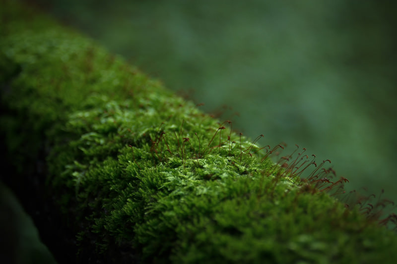 遊歩道の手すりをびっしりと埋め尽くす苔の写真素材です。木製の手すりに鮮やかな緑色の苔が密生し、梅雨の時期に湿潤な環境で育った様子が映っています。ジメジメとした季節感や湿度の高い自然環境の表現が必要な場面で活用できます。