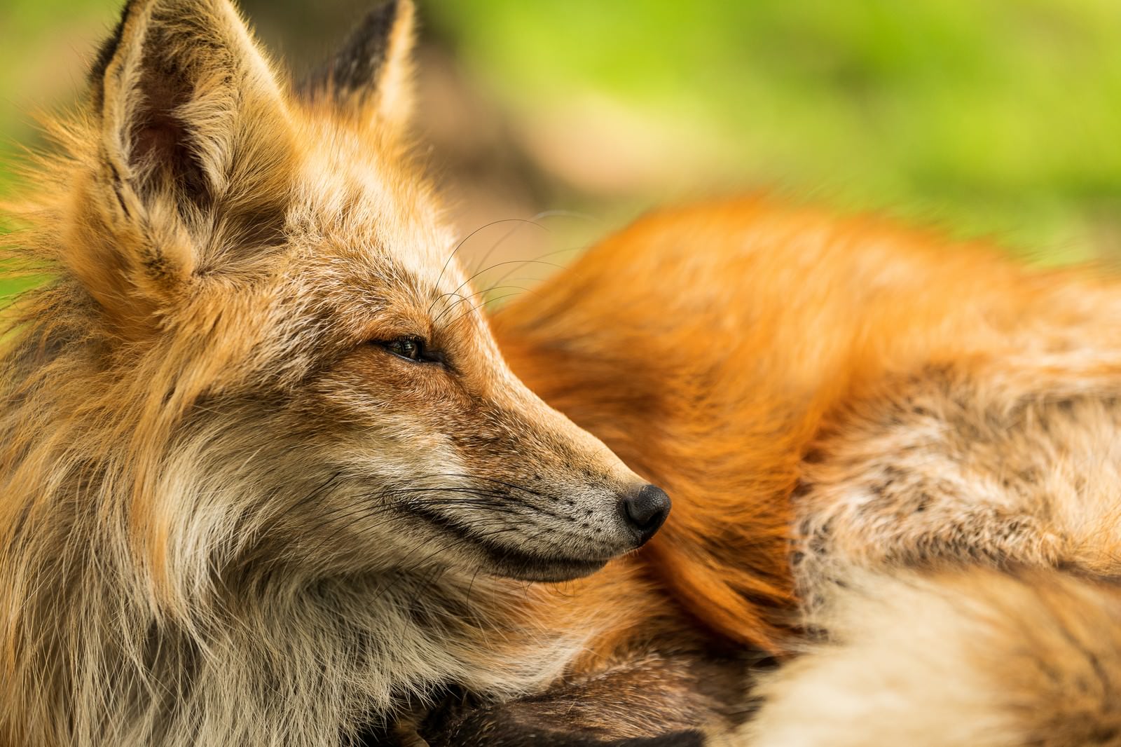 キツネの横顔を撮影した写真素材です。茶色と白色の毛並みで、鋭い眼差しと尖った耳を持つこのイヌ科の野生動物が横を向いており、その自然な表情と姿態が捉えられています。動物関連のコンテンツや自然をテーマとしたデザイン制作などにおすすめです。