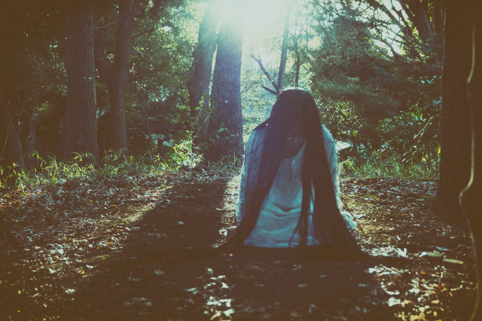 森の中で蹲りながら近づいてくる女性の写真素材です。暗い森の中で白い服を着た女性が蹲った姿勢で佇んでおり、逆光により白と黒の不気味なシルエットが浮かび上がっています。陰陽の対比が強調された恐怖感のある画像で、ホラー系のWebサイトやブログ記事、怖い話の挿絵などにおすすめです。