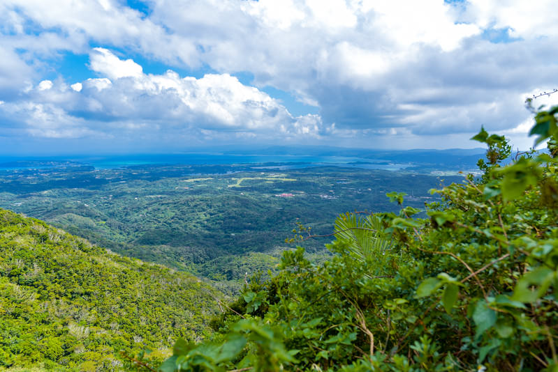 登山中の嘉津宇岳から見た沖縄の街並みの写真素材です。緑豊かな山々の向こうに青い海と海岸線が広がり、白い雲が空に浮かんでいます。名護地域の地形と自然の美しさを感じられ、観光情報やトラベル関連、地域紹介コンテンツなどに活用できます。