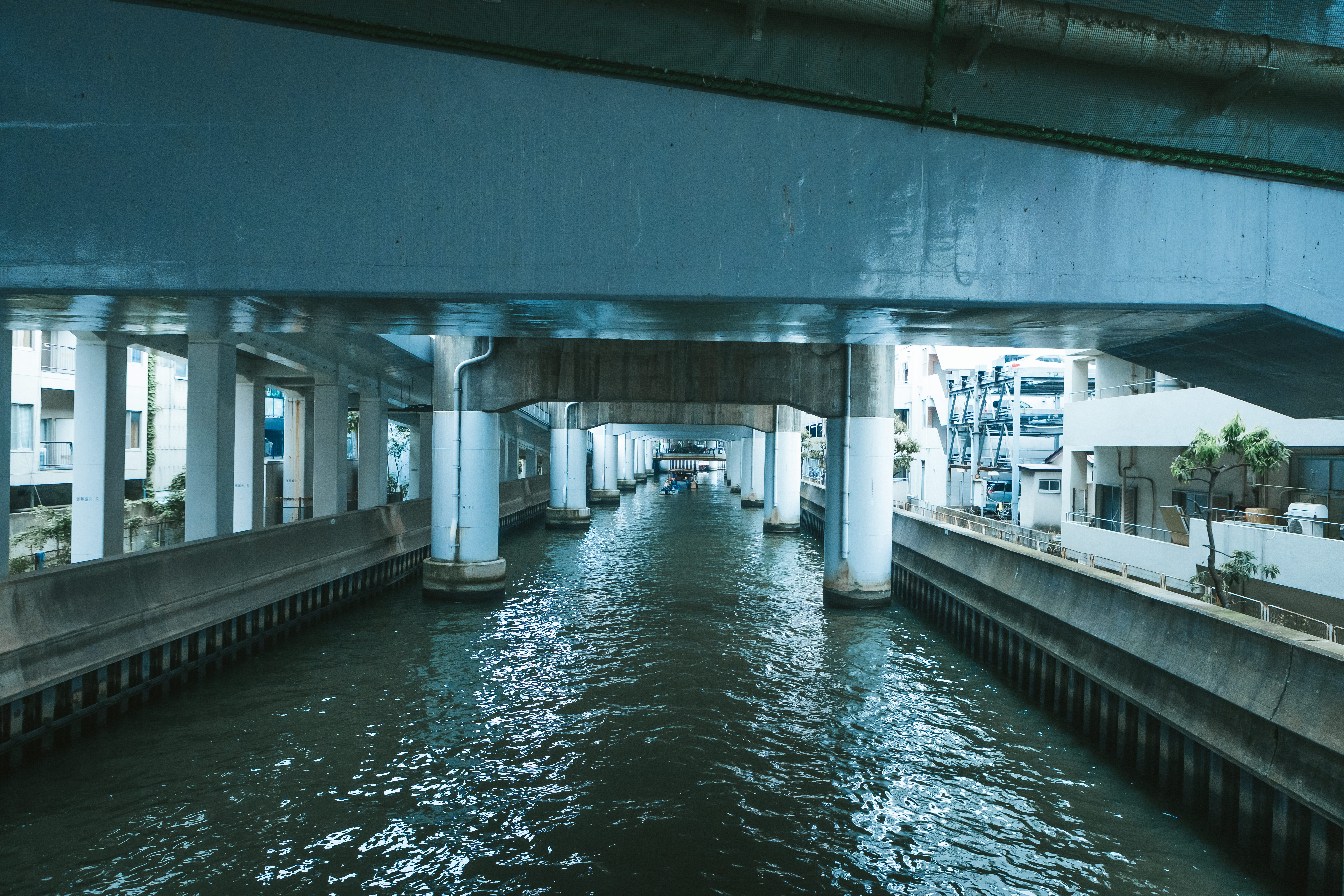 高架下の道頓堀川沿いで撮影したエアコン室外機の写真素材です。年季の入った汚れと地面に伸びる排水ホースが生活感を出しています。都市の日常や老朽化した設備を伝えるコンテンツにおすすめです。