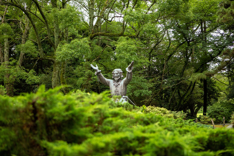 出雲大社の大国主大神の石像の写真素材です。緑豊かな木々に囲まれた白い石像が佇み、葉間から光が差し込んでいます。出雲大社は縁結びの神として知られており、参拝ガイドや寺社仏閣を扱うコンテンツ、神社参拝情報などにおすすめです。