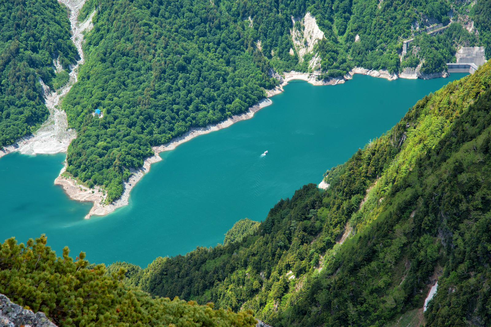 Kurobe Dam and Sightseeing Boat Viewed from Mount Harinoki