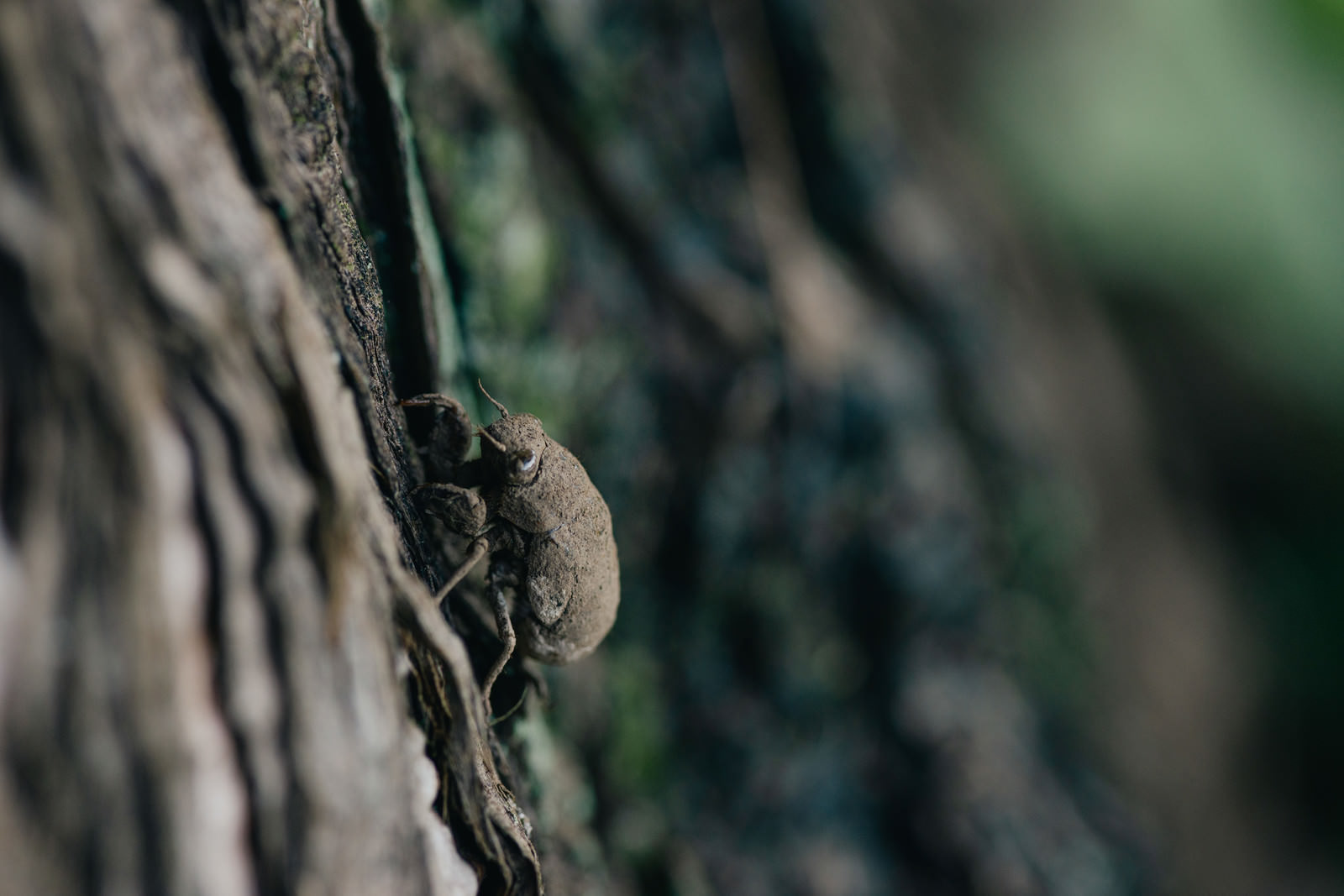 全身に泥をかぶったニイニイゼミの幼虫の写真素材です。地中から羽化するために地表に出た幼虫が木の表面に止まった状態で、羽化前の脱皮準備段階を記録しています。昆虫図鑑や生態観察の資料、自然学習教材などにおすすめです。