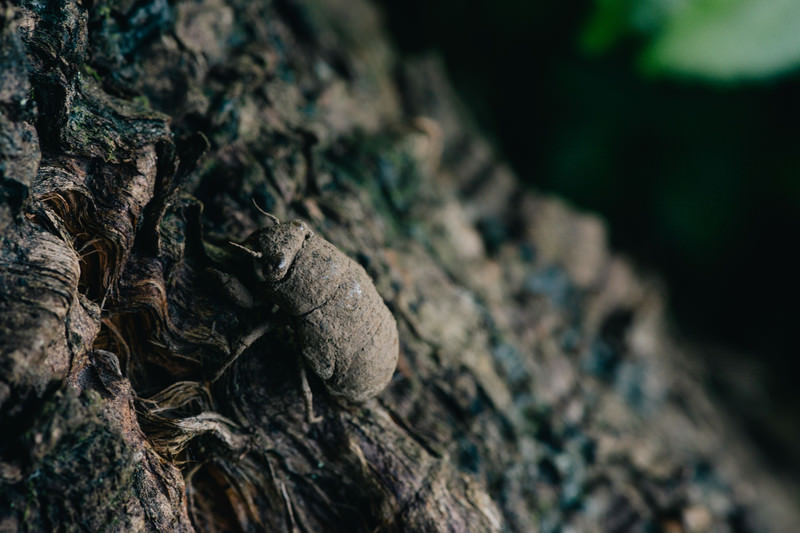 脱皮前のニイニイゼミの写真素材です。地中から這い出した茶褐色の幼虫が木の幹を登り、羽化を控えた状態で脱皮場所へ移動する生態が観察できます。昆虫観察や生物学習などにおすすめです。
